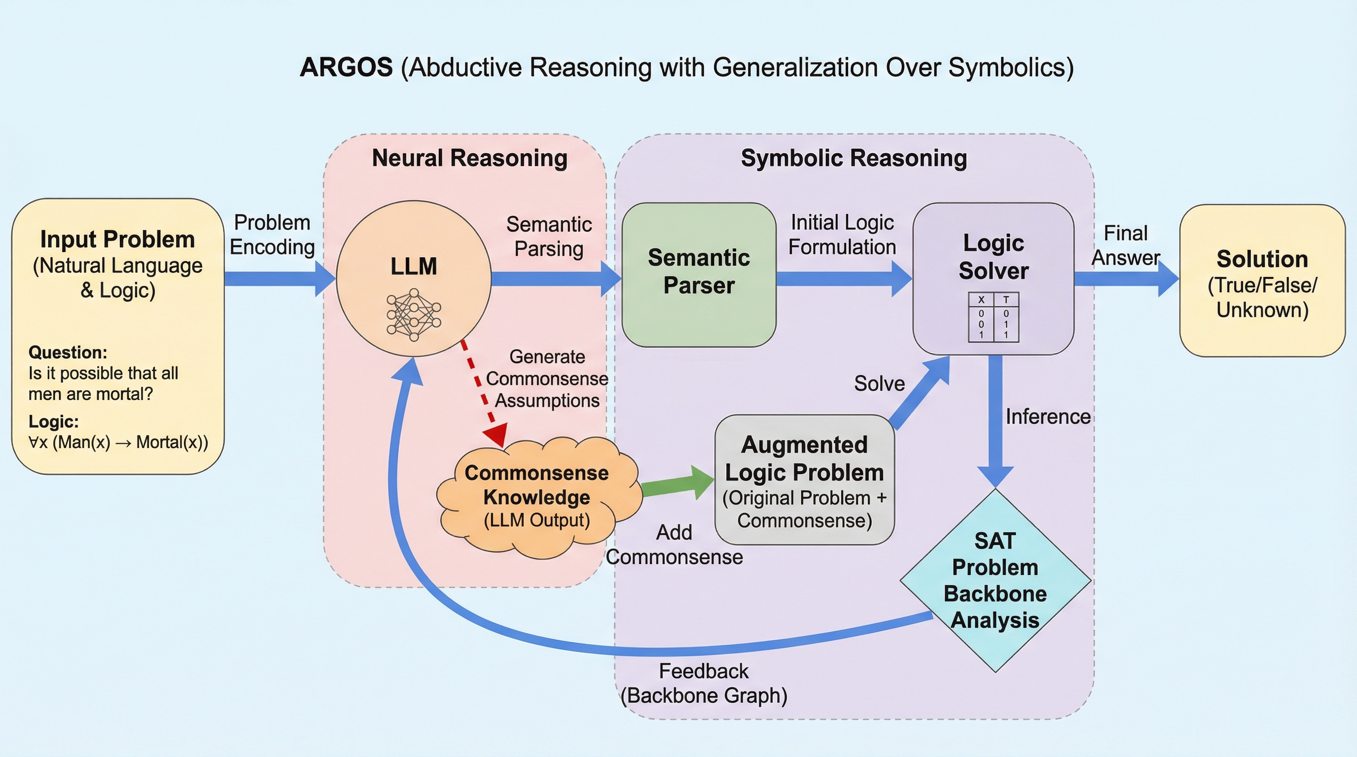 大規模言語モデル(LLM)の柔軟な知識とロジックソルバーの厳密な推論を融合させ、問題文に明示されていない常識的な前提知識を動的に補完しながら推論を行う新手法「ARGOS」が開発されました。 この手法は、ロジックソルバーから得られる論理的基盤(バックボーン)をフィードバックとして活用し、LLMが不足している常識的な関係性を反復的に生成・検証することで、従来の演繹的手法では解決困難だった不完全な情報を含む問題に対応します。 複数の論理推論ベンチマークを用いた検証において、ARGOSは既存のニューラル手法やシンボリック手法を安定して上回る精度を達成し、人間のようなアブダクション(仮説生成)推論が複雑な論理課題の解決に極めて有効であることを実証しました。