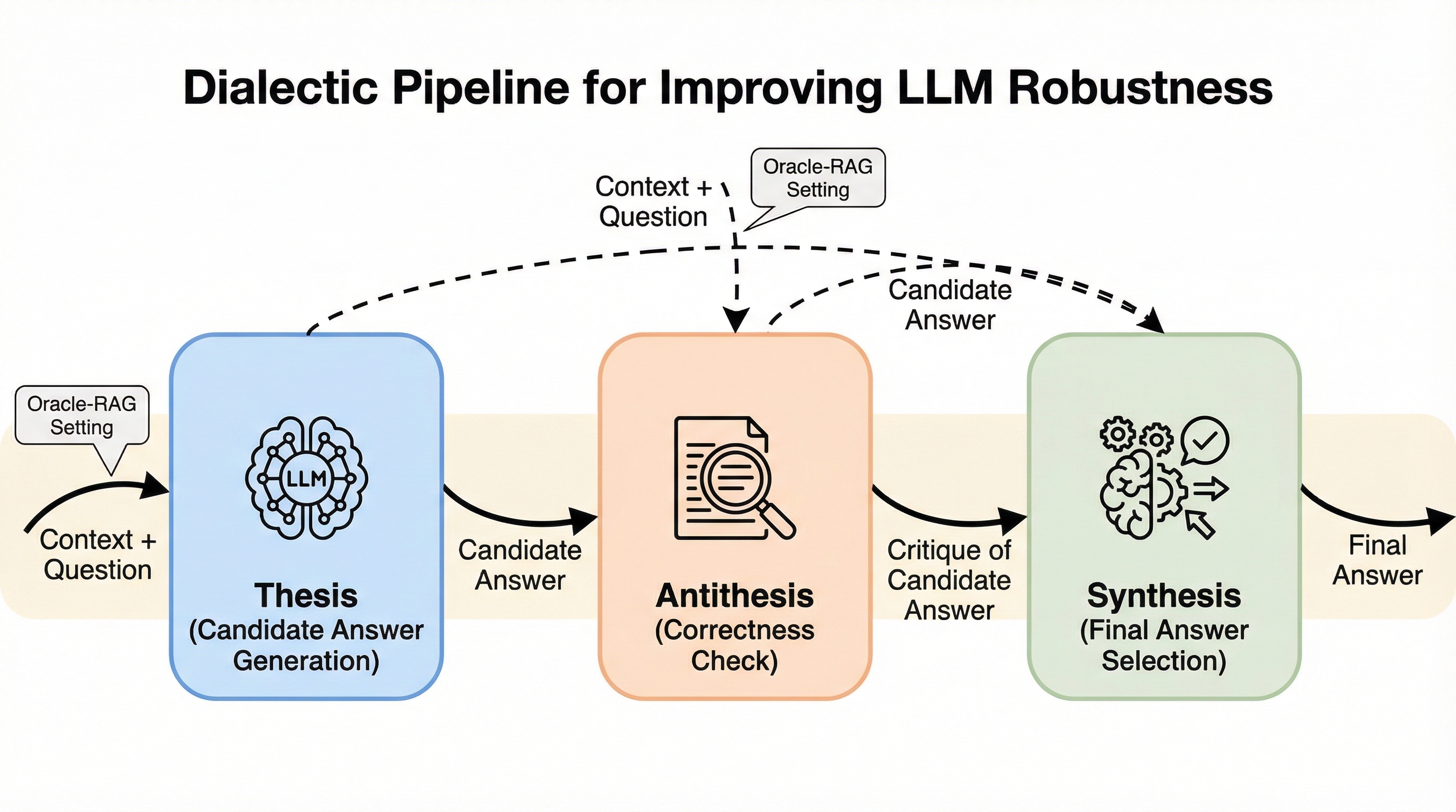 大規模言語モデル(LLM)の課題であるハルシネーションを抑制するため、ヘーゲル哲学の弁証法に着想を得た「対話的パイプライン(Dialectic Pipeline)」が提案されました。この手法は、モデルが「正(Thesis)」「反(Antithesis)」「合(Synthesis)」という3つの段階を経て自己対話を行うことで、初期の回答を批判的に検討し、最終的な結論を洗練させる仕組みです。 検証の結果、複数の知識源を統合する複雑なマルチホップ質問応答タスクにおいて、標準的な回答手法や既存の「思考の連鎖(Chain-of-Thought)」を大幅に上回る精度と信頼性を達成しました。また、外部知識を活用するRAG環境において、情報の要約や勾配ベースのフィルタリングを組み合わせることで、モデルの規模や種類を問わず回答の質がさらに向上することが確認されました。 本研究は、追加学習や特定のドメインへの特化を必要とせず、プロンプトの構造を工夫するだけでモデルの汎用性を維持したまま堅牢性を高められることを示しています。特に、推論能力と内容抽出能力の両方が求められる多段階の質問応答において、自己修正プロセスが極めて有効であることを実証し、実用的なフレームワークを提供しています。