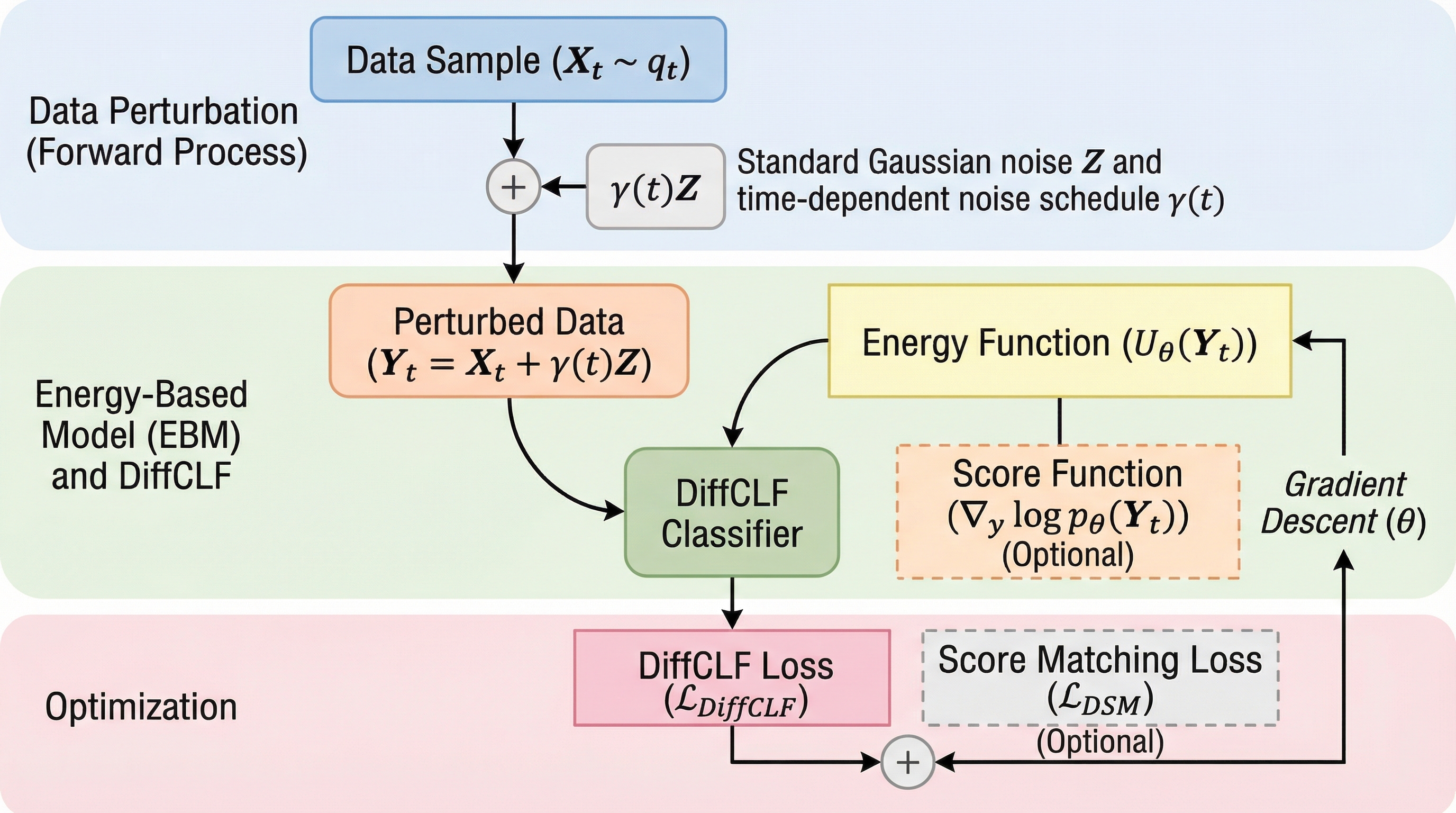 本研究では、エネルギーベースの生成モデルを直接学習し、下流タスクでエネルギー値をそのまま利用可能にするための新しい目的関数として「Diffusive Classification(DiffCLF)」を提案している。この手法の核心は、対数密度の推定を、異なるノイズレベルにおけるデータの「教師あり分類問題」として再構成した点にある。…