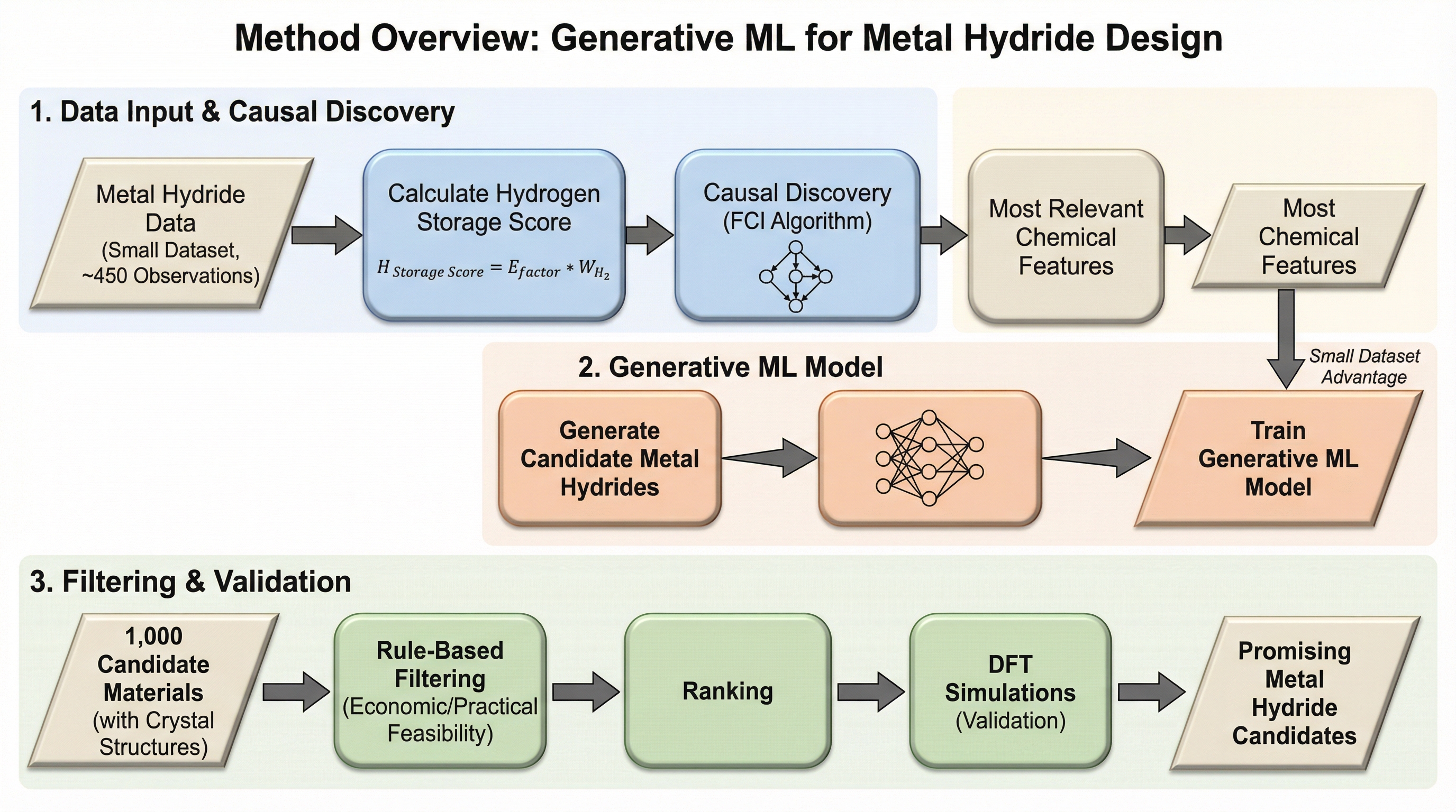 カーボンニュートラル実現に不可欠な水素貯蔵技術において、従来の実験や計算手法の限界を打破するため、因果探索アルゴリズム(FCI)と軽量な変分オートエンコーダ(VAE)を組み合わせた新しい材料設計フレームワークを開発しました。 この手法は、わずか450個という極めて小規模なデータセットからでも、因果関係に基づき重要な特徴量を特定することで「次元の呪い」を回避し、既存のデータベースには存在しない新しい結晶構造を持つ金属水素化物を効率的に生成することが可能です。 生成された1,000個の候補から、これまで報告されていなかった6つの新規材料を特定し、そのうち4つが密度汎関数理論(DFT)シミュレーションによって実用的な水素貯蔵特性を持つことが確認され、民生用GPUで実行可能な低コストな探索手法としての有効性が示されました。