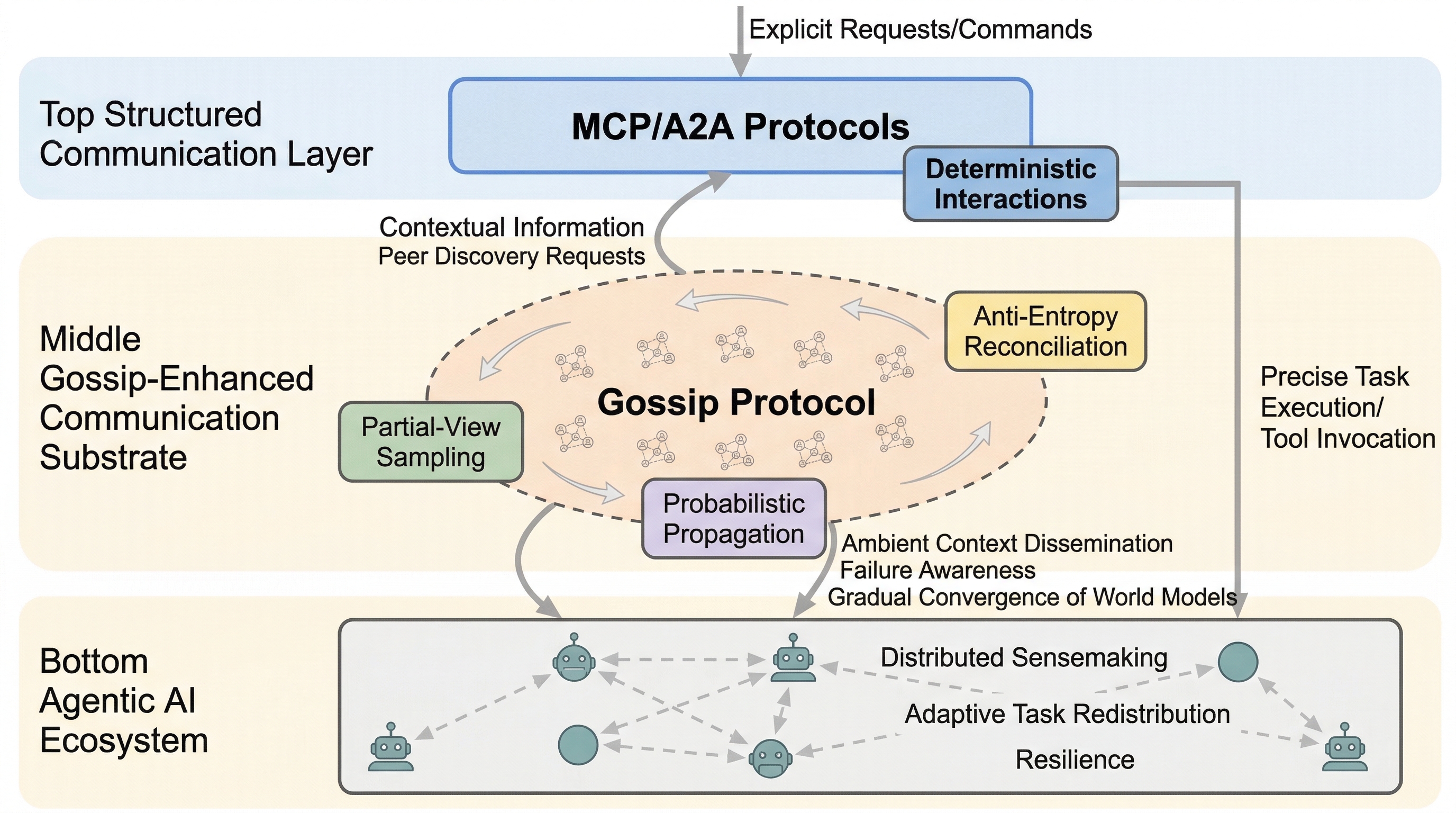 提案の中心は Gossip-Enhanced Agentic Coordination Layer (GEACL) です。これは MCP、A2A、ACP のような構造化メッセージ層を置き換えるのではなく、その下で継続的に走る調整基盤として置く設計です。著者たちの言葉で言えば、必要なところでは構造化し、効果があるところでは適応的にする、という分担です。厳密さが必要な操作は既存プロトコル、広い状況共有と創発的な協調は gossip が担います。