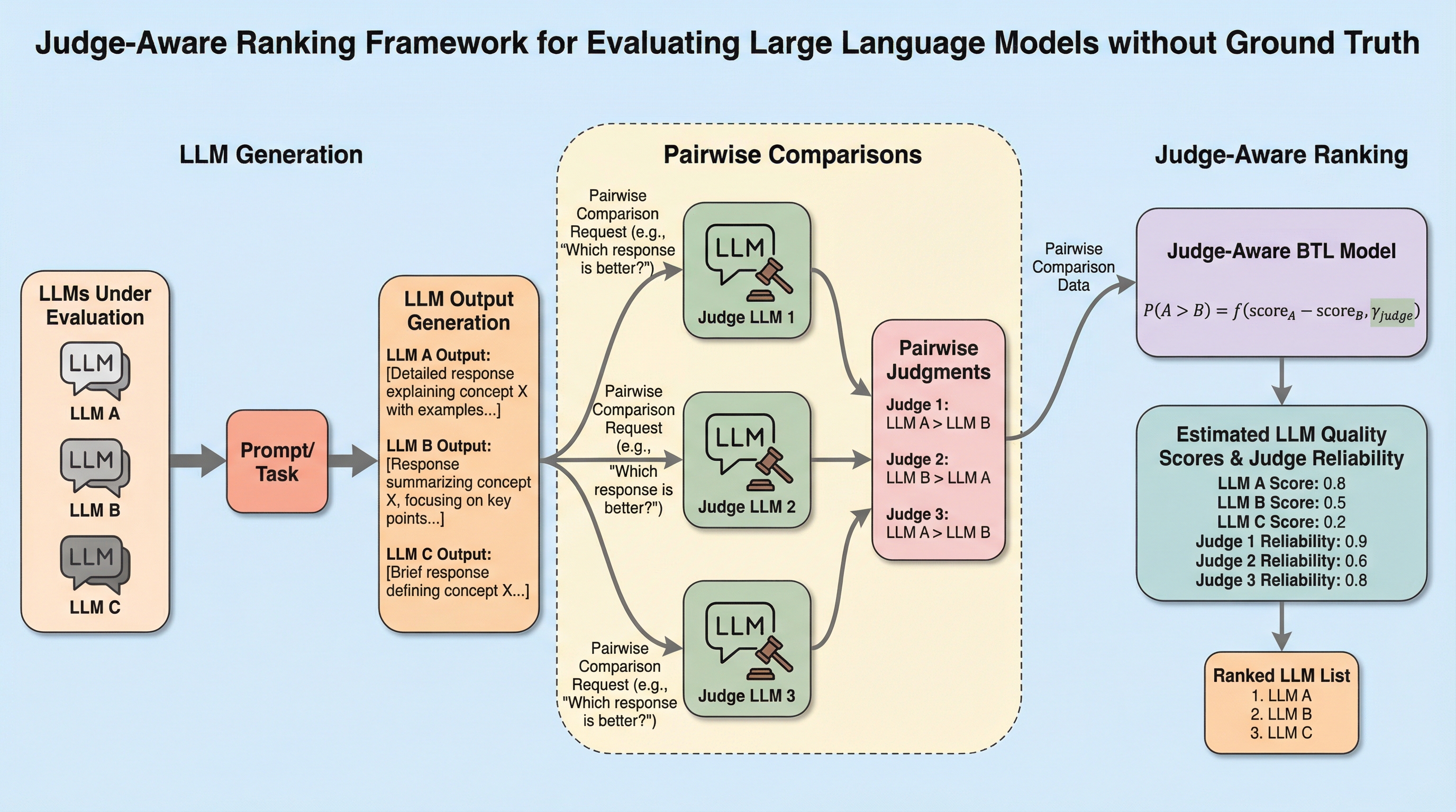 本研究では、ペア比較データからモデルの品質スコアと審査員の信頼性を同時に推定する、新しい「審査員考慮型(Judge-Aware)」ランキングフレームワークを提案しています。このフレームワークは、統計的なランキングモデルとして長い歴史を持つBradley–Terry–Luce(BTL)モデルを基礎とし、それを現代のLLM評価の文脈に合わせて拡張したものです。具体的には、各審査員に対して固有の「識別パラメータ(discrimination parameter)」を導入し、審査員がモデル間の品質差をどれだけ敏感に察知できるかを数理モデルに組み込みました。…