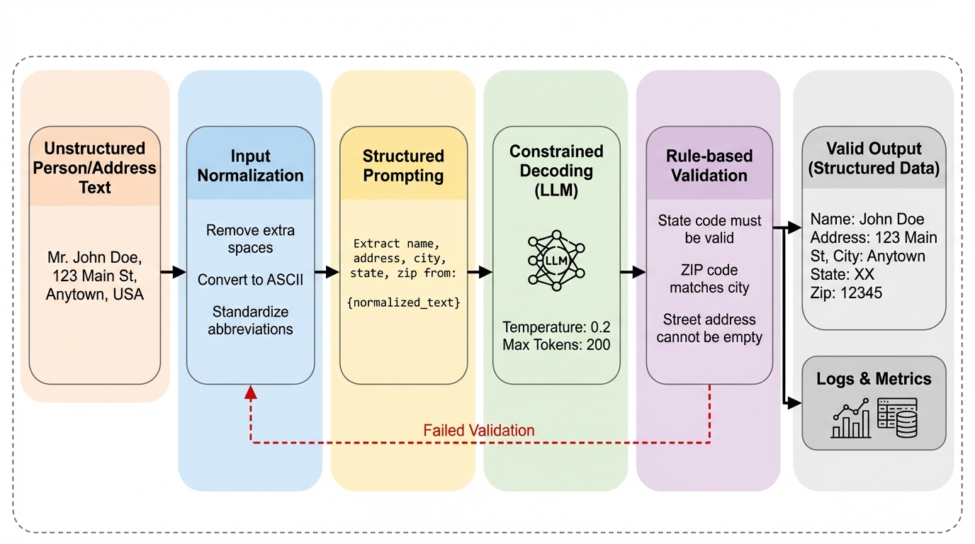 非構造化された氏名や住所のテキストを、大規模言語モデルと決定論的な検証レイヤーを組み合わせることで、17項目の詳細なスキーマに変換する新しいフレームワークを提案しました。 追加のファインチューニングを一切行わず、入力の正規化、構造化されたプロンプト、制約付きデコード、そして厳格なルールベースの検証を統合することで、99.8%という極めて高い解析精度を達成しています。 このシステムは、多言語対応や誤字脱字への耐性を持ちながら、郵便番号と州の整合性チェックなどの実世界の制約を強制することで、大規模な情報システムにおける信頼性と再現性の高いデータ抽出を低コストで実現します。
