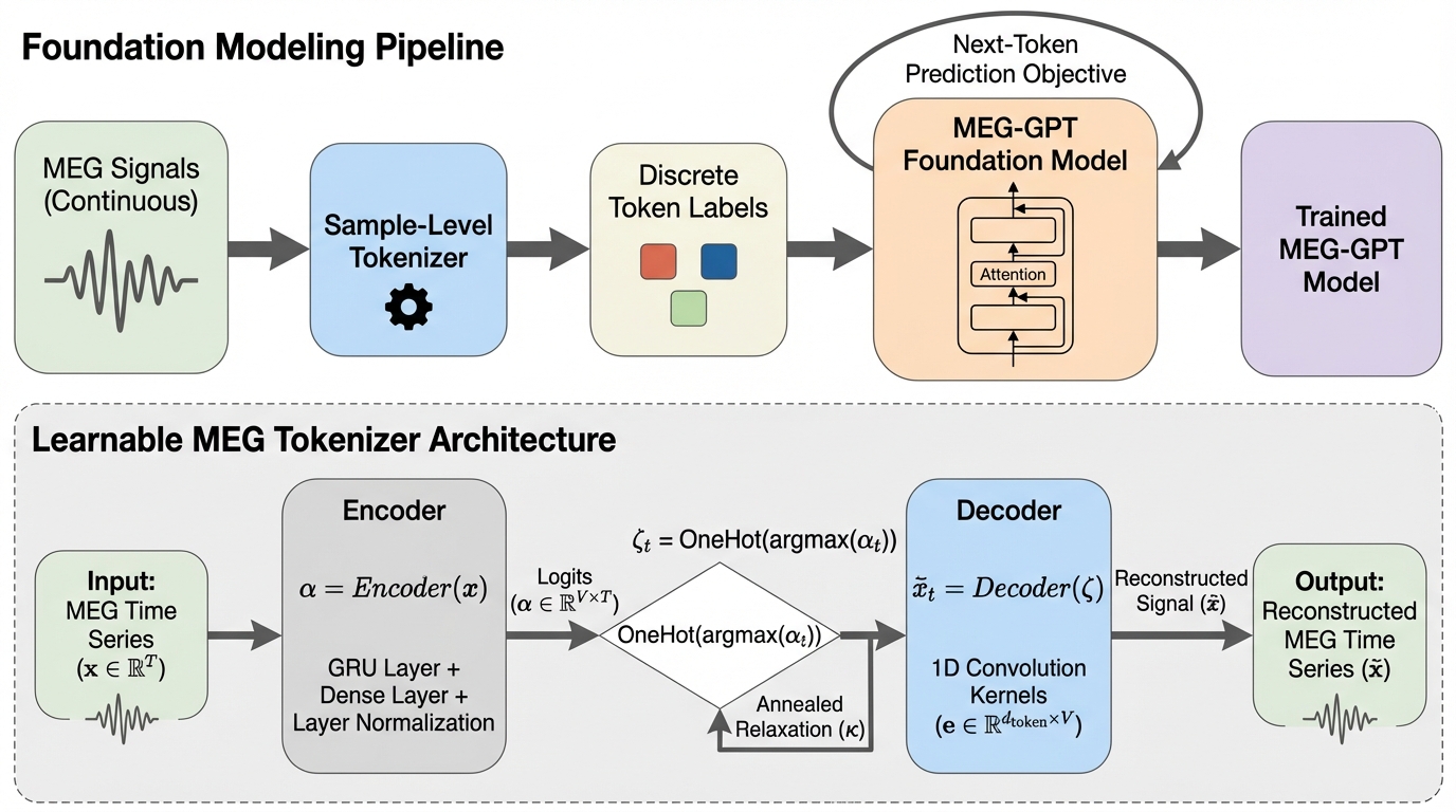 自然言語処理や視覚分野での基盤モデルの成功を受けて、神経画像データでも大規模な基盤モデルを作り、少量のラベルや課題情報に依存せずに汎用表現を学習したいという関心が高まっています。特にEEGやMEGは時間分解能が高く、多変量で長い時系列になりやすいため、自己教師ありで大規模事前学習を行う発想と相性がよいとされています。一方で、トランスフォーマー系のモデルを適用するには、連続値の時系列を離散的な記号列に変換する「トークナイゼーション」が設計上の中心になります。ここでのトークン化は単なる前処理ではなく、表現の粒度やモデルに入る帰納バイアスを左右し、結果として下流性能や生成挙動まで影響し得る部品です。 しかし、神経信号向けにどのトークナイゼーションが望ましいのか、またその違いが何にどの程度効くのかは十分に整理されていません。一般の時系列向けに発展した方法は、小売・金融・疫学などを想定しており、振動ダイナミクスやスペクトル構造、振幅分布が概ねガウス的と述べられる神経信号の性質と一致するとは限りません。適切でないトークン化は、生物学的に意味のある構造を見えにくくしたり、データの統計性質に合わない仮定を押し付けたりするおそれがあります。…