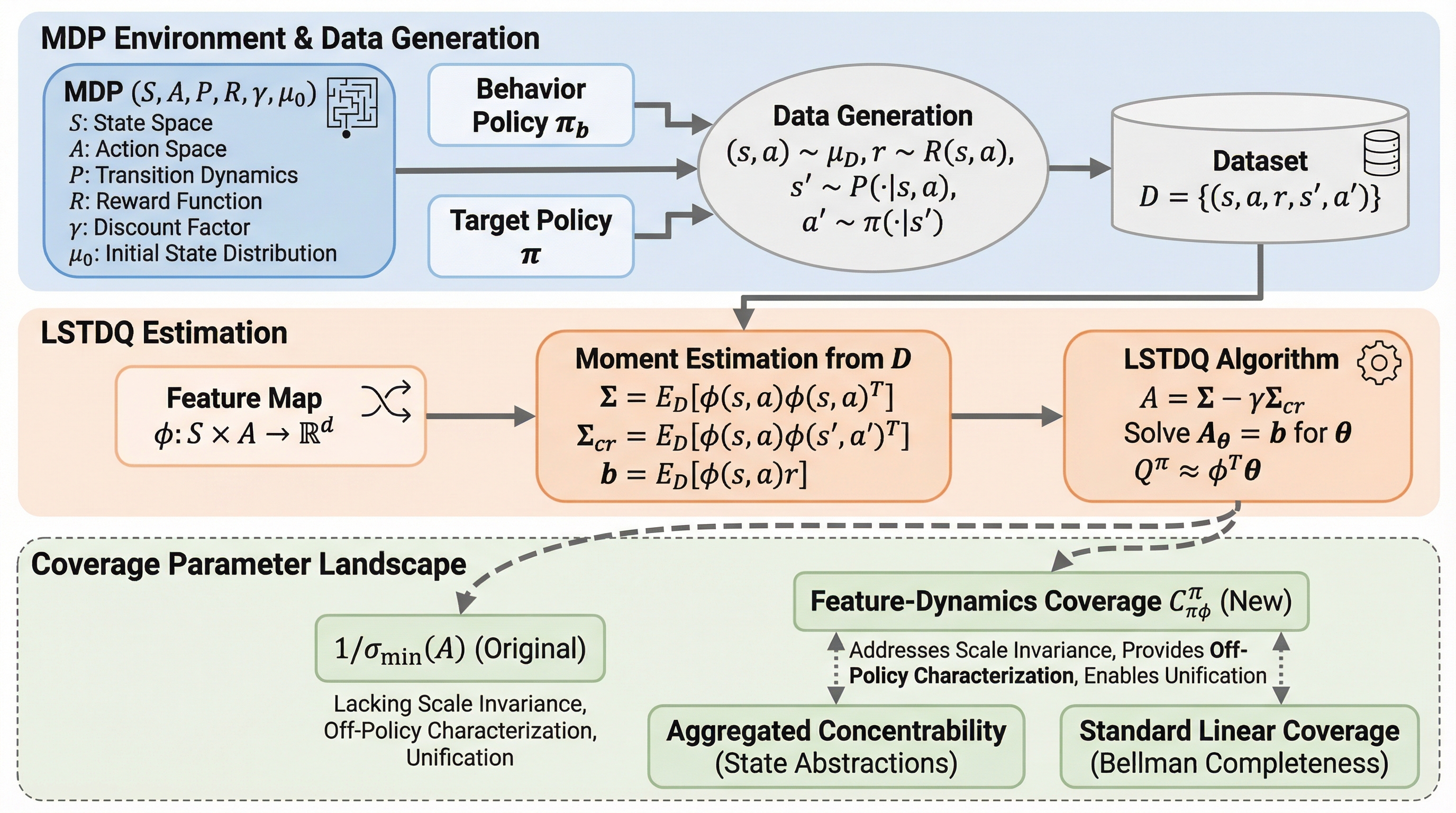 強化学習におけるオフポリシー評価(OPE)は、過去の異なる方策(振る舞い方策)によって収集された固定データセットのみを用いて、未知の新しい方策(ターゲット方策)の性能を推定する技術であり、実世界への応用において極めて重要な役割を果たす。このタスクの成功を左右する核心的な概念が「カバレッジ」である。カバレッジは、収集されたデータがターゲット方策の評価に必要な情報をどの程度含んでいるかを数学的に特徴づけるものであり、データの分布シフトという強化学習の根本的な課題を定量化する役割を担う。しかし、最も基本的かつ広く用いられる設定の一つである「ターゲットの価値関数が与えられた特徴量に対して線形である(線形実現可能性)」という最小限の仮定の下では、このカバレッジの適切な定義についてはこれまで理解が不足しており、議論が断片化していた。 従来、この設定で最も標準的なアルゴリズムとされるLSTDQ(最小二乗時間差学習)の解析では、推定に用いる行列の最小特異値の逆数がカバレッジの役割を果たすと考えられてきた。しかし、この指標には重大な欠点が三つ存在する。第一に、尺度不変性の欠如である。…
