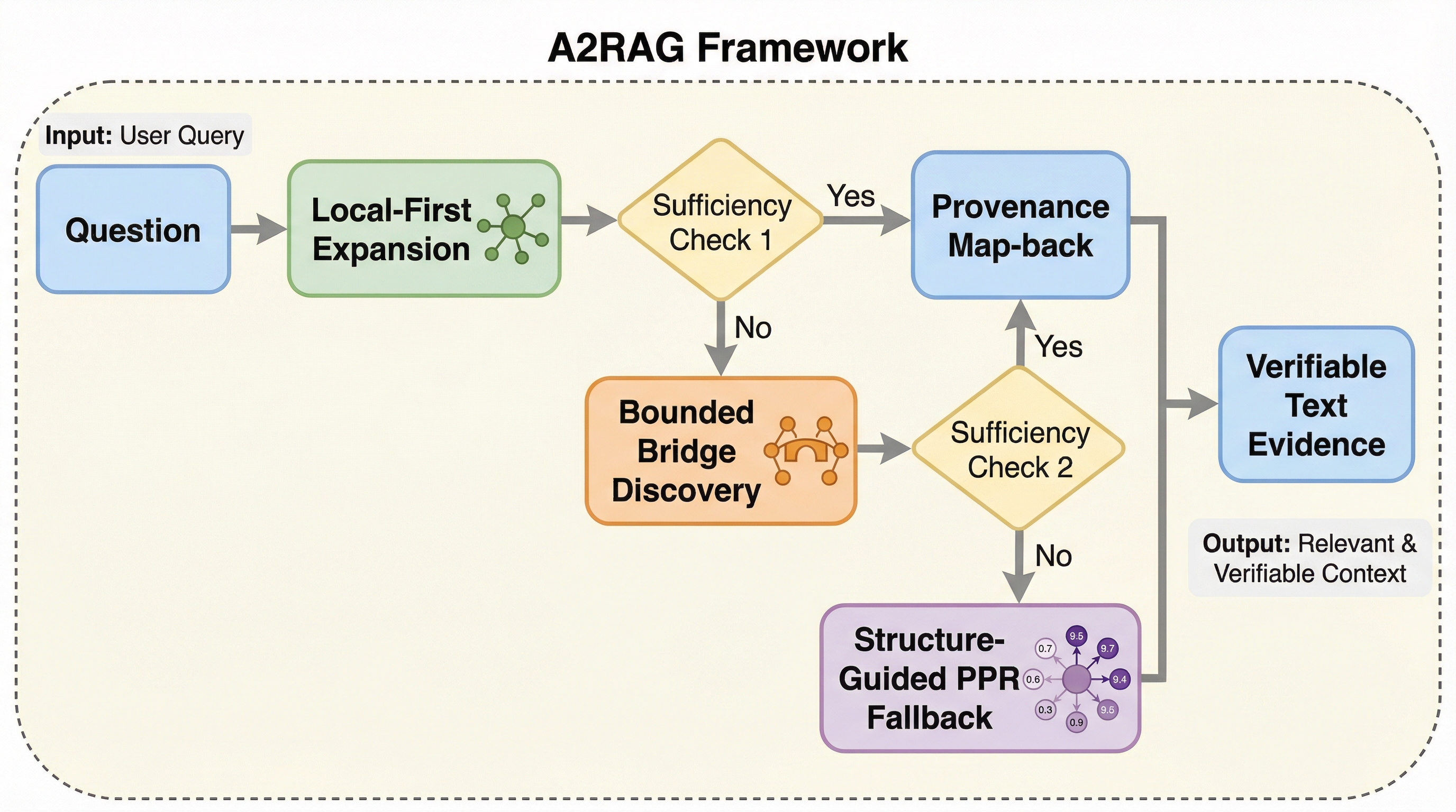 従来のGraphRAGは、全ての質問に対して一律の高度な検索を行うため、簡単な質問での過剰なコスト消費と、複雑な質問におけるグラフ化の際の情報欠落という二つの課題を抱えていました。 本研究が提案するA2RAGは、回答の妥当性を検証して必要時のみ再試行する「適応型制御ループ」と、局所から広域へ段階的に探索範囲を広げつつ元のテキストから詳細を復元する「エージェント型検索機」を統合したフレームワークです。 ベンチマークを用いた検証では、従来の反復的な手法と比較して検索精度を最大11.8ポイント向上させつつ、トークン消費量と処理遅延を約50パーセント削減することに成功し、実用的な効率と信頼性の両立を証明しました。