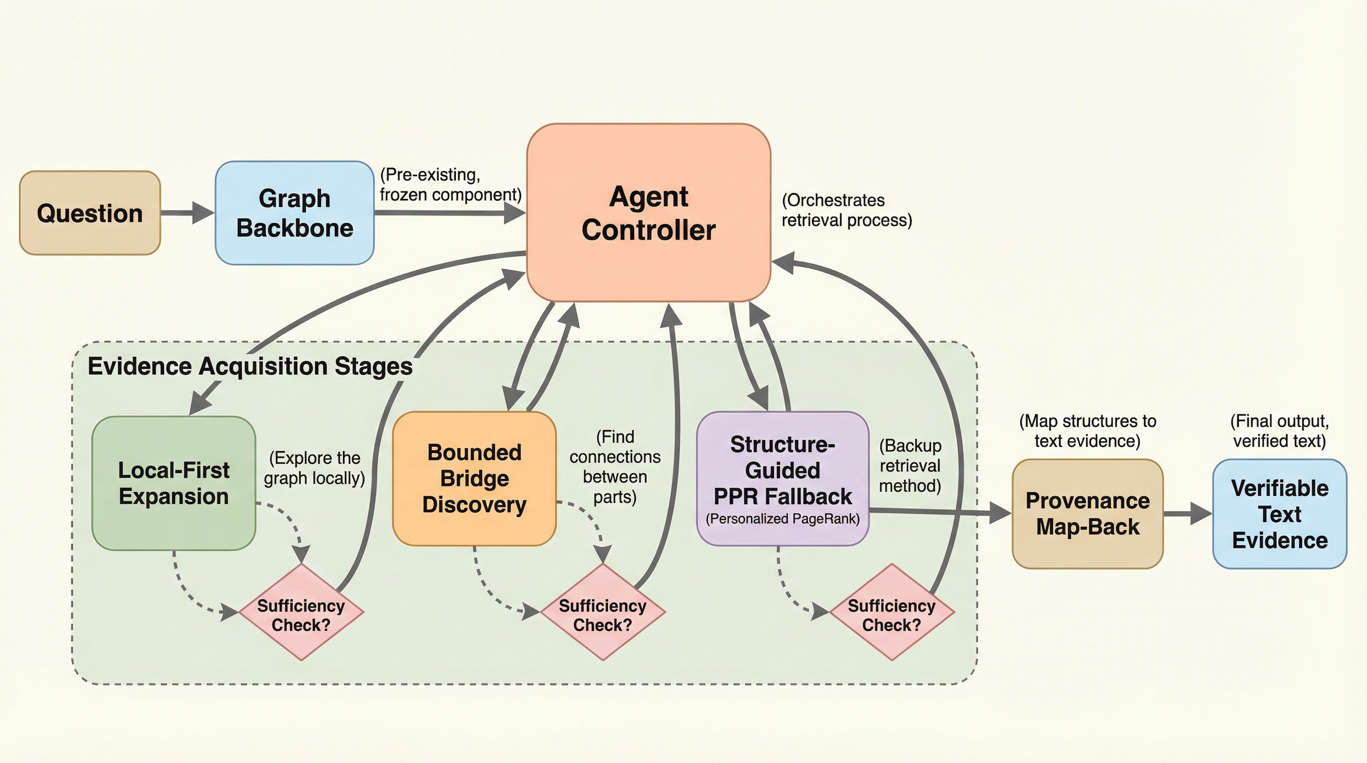 本論文では、回答レベルの信頼性制御と、検索レベルの段階的な証拠取得を切り離した統合フレームワーク「A2RAG(Adaptive Agentic Graph Retrieval-Augmented Generation)」を提案している。このフレームワークの核心は、検索を「予算の範囲内で実行される動的でコスト意識の高いプロセス」として再定義した点にある。具体的には、2つの主要なレイヤーで構成されている。 一つ目は「適応型コントロールループ(Adaptive Control Loop)」である。これは、最終的な回答が取得された証拠と照らし合わせて信頼できるかどうかを検証するクローズドループ機構である。このループは、単に検索を繰り返すのではなく、証拠の関連性、回答の根拠、クエリの解決度という3つの観点(Triple-Check)から失敗のモードを診断する。…