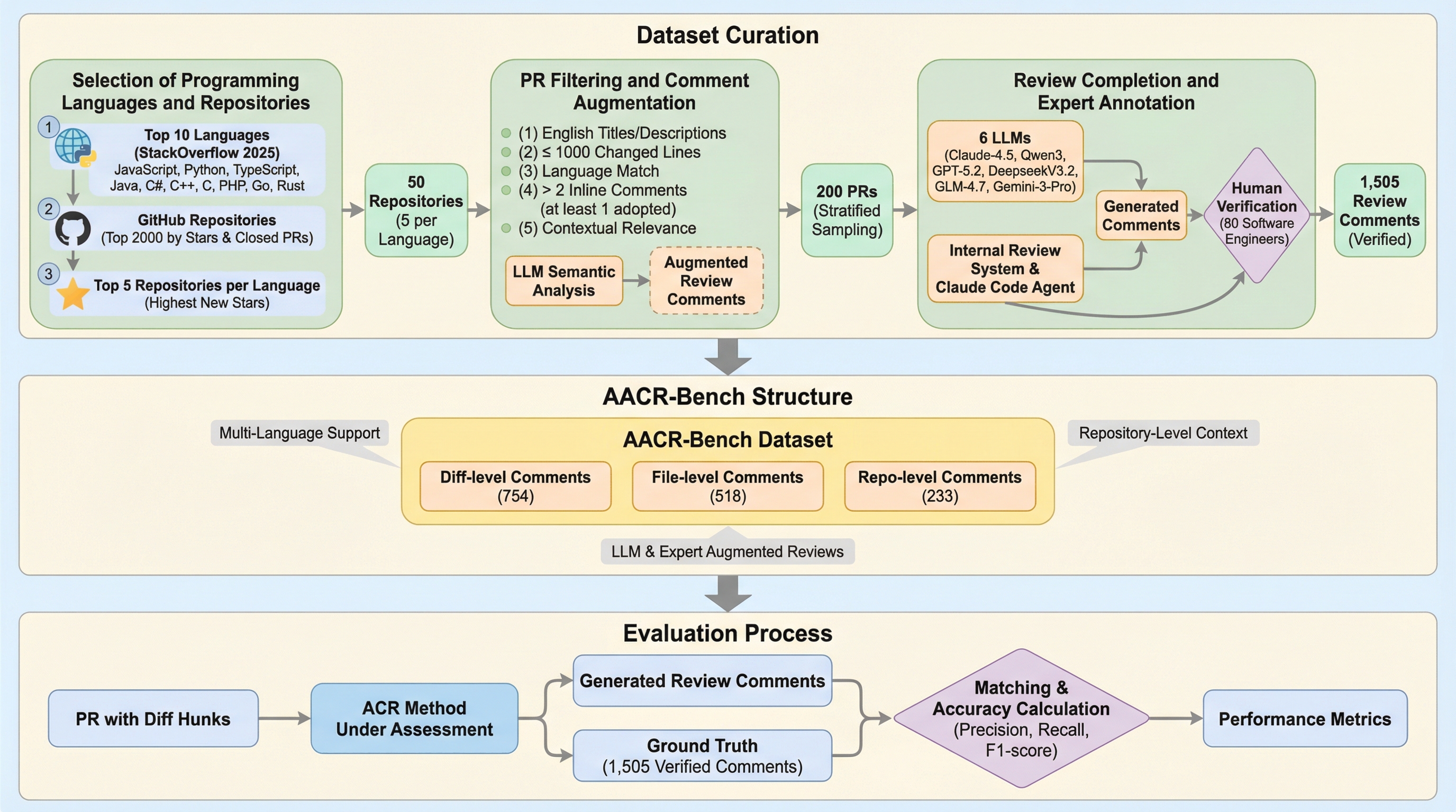 本研究では、上述の課題を克服するために、リポジトリレベルの文脈認識をサポートする多言語ACRベンチマーク「AACR-Bench」を提案した。このベンチマークは、最新のStackOverflow開発者調査に基づき、JavaScript、Python、TypeScript、Java、C#、C++、C、PHP、Go、Rustという、現代のソフトウェア開発で最も広く使われている10種類の主要プログラミング言語を網羅している。各言語につき5つの人気リポジトリを選定し、合計50のリポジトリから抽出された200件のプルリクエストを評価単位として構成している。これにより、特定の言語に依存しない、極めて汎用性の高い評価が可能となった。 AACR-Benchの最も革新的な点は、そのデータ構築手法にある。…