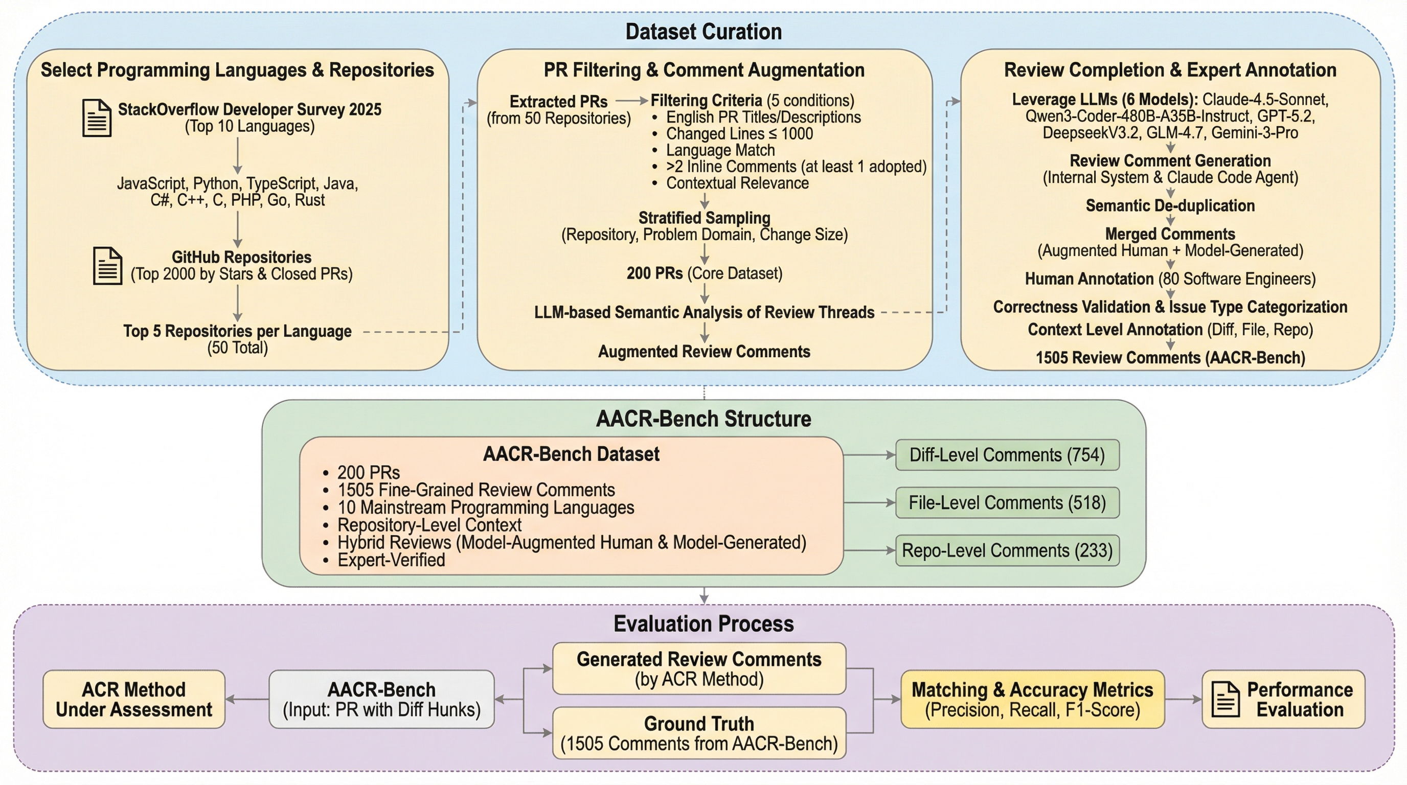 本研究は、これらの課題を解決するために、リポジトリレベルの文脈をサポートする多言語ACRベンチマーク「AACR-Bench」を提案しました。このベンチマークの最大の特徴は、AIによる支援と人間による専門的な検証を組み合わせた「AI-assisted, Human expert-verified」という高度なアノテーションパイプラインを採用している点にあります。具体的には、GitHub上の50の人気リポジトリから抽出された391件のリアルなレビューコメントに加え、80名の熟練ソフトウェアエンジニア(実務経験2年以上)が、6つの主要なLLM(Claude-4.5-Sonnet、GPT-5.2、Qwen3-Coder-480B、DeepSeek-V3.2、GLM-4.7、Gemini-3-Pro)によって生成された2,145件のコメントを精査しました。…