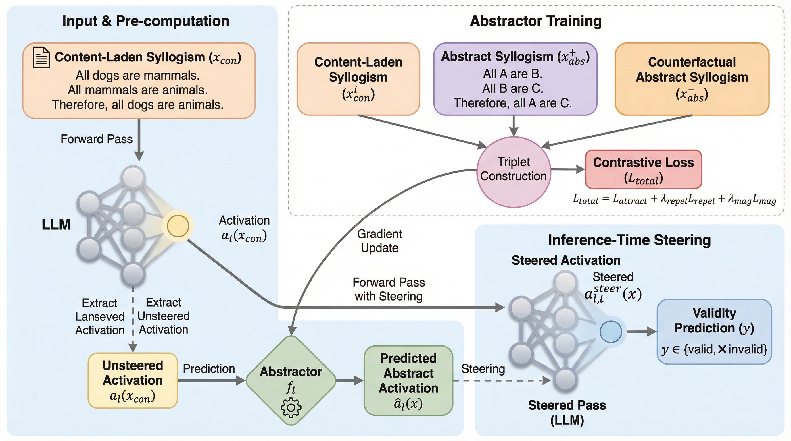 狙いは、三段論法のような形式推論を、語の意味的もっともらしさに引っ張られず評価できるようにすることです。 / そのために、抽象入力で得られる内部表現を「抽象アクティベーション空間」として定義し、内容つき入力の推論中にその空間へ表現を寄せる介入を行います。 / 結果として、Chain-of-Thought より bias-penalised accuracy で強く、SFT と比べても重みを変えずに内容依存の推論バイアスを抑えられる可能性を示しています。