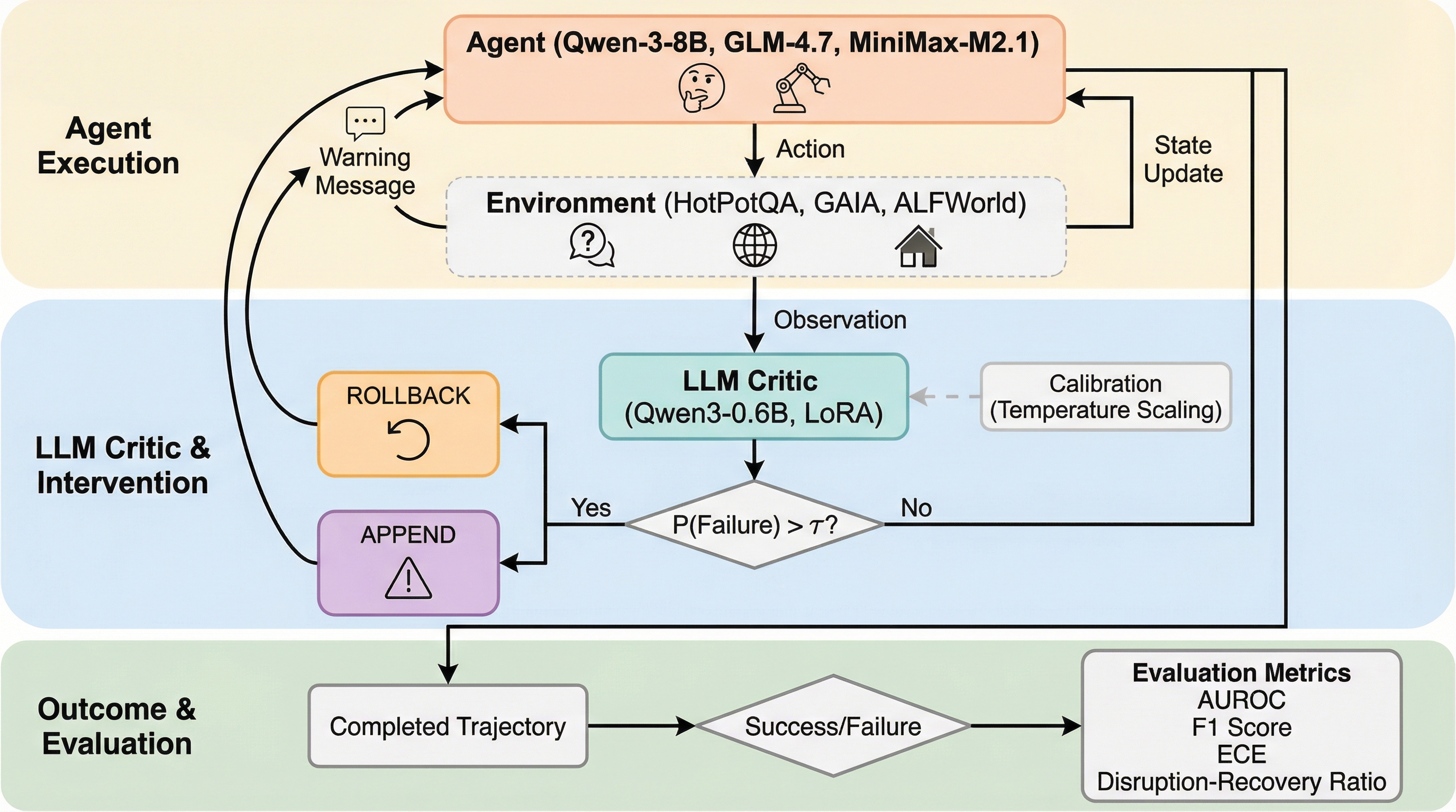本研究の核心は、介入の効果を「回復(Recovery)」と「中断(Disruption)」のトレードオフとして定式化したことにあります。研究チームは、エージェント単体(ベースライン)と、エージェントに批判モデルを加えたシステム(介入あり)の実行結果を比較するために、2×2の出力テーブルを定義しました。このテーブルでは、ベースラインが失敗して介入によって成功したケースを「回復(C)」、ベースラインが成功していたのに介入によって失敗したケースを「中断(B)」としてカウントします。これに基づき、ベースラインの失敗率(p)、回復率(r)、中断率(d)という3つの指標を導入しました。 成功率の変化(ΔSuccess)は、「p × r - (1 - p) × d」という数式で表されます。…