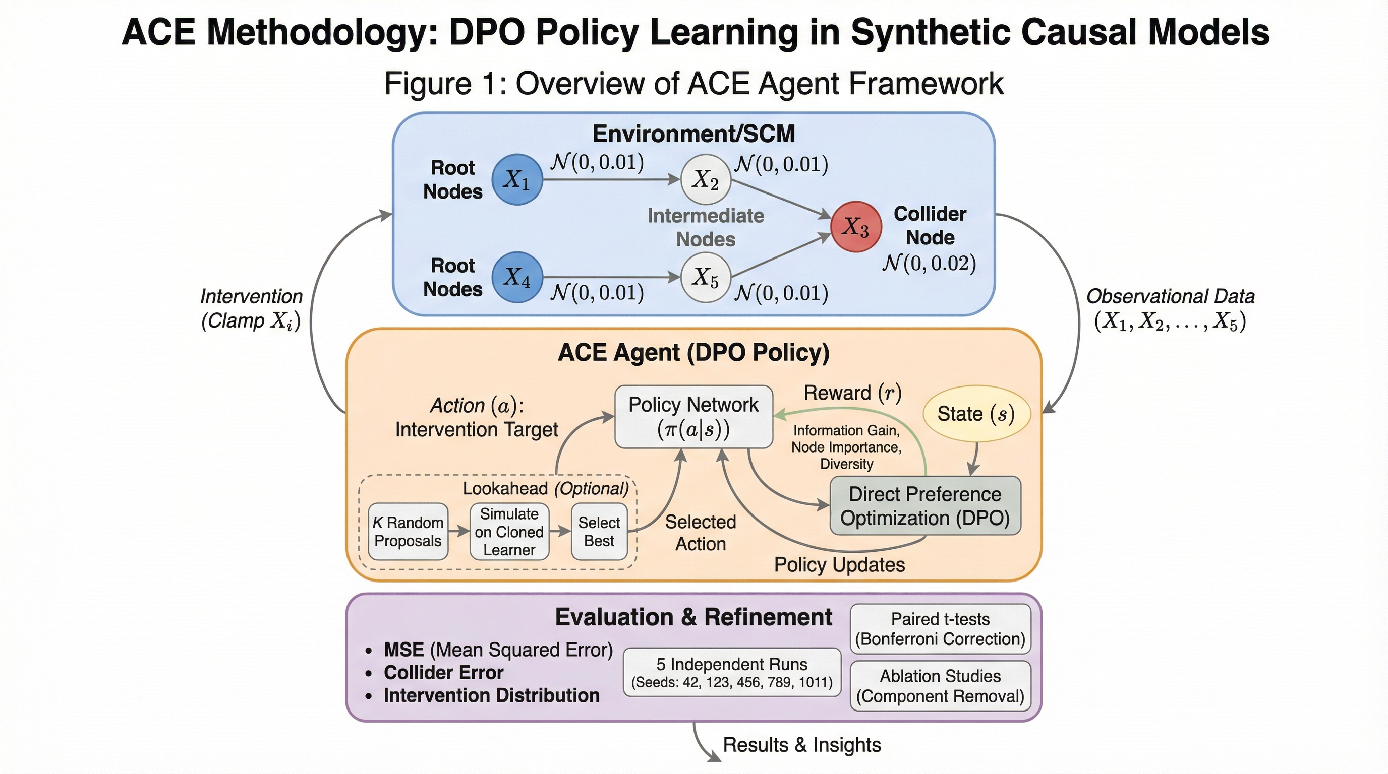 提案はActive Causal Experimentalist(ACE)です。 因果実験の設計を、逐次意思決定の「方策(ポリシー)」として学習する枠組みです。ここでの主語はデータだけではなく、「実験の進め方」そのものになります。