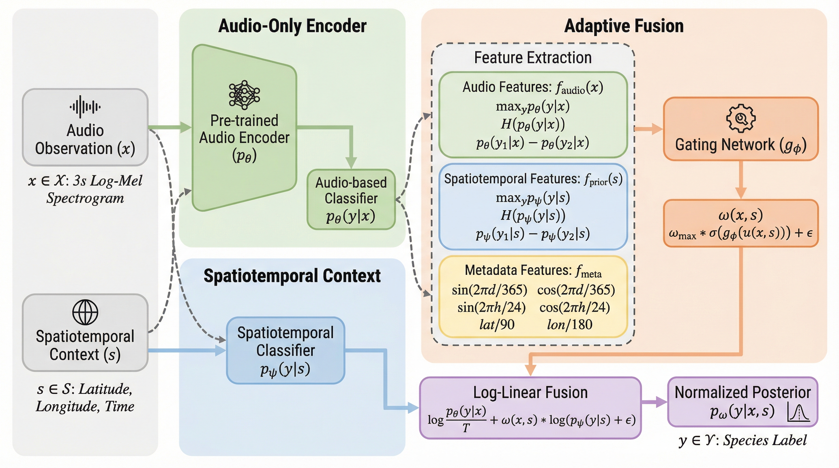 論文が提案するのは FINCH(Fusion under INdependent Conditional Hypotheses) という、適応的ログ線形の証拠融合フレームワークです。 構成要素は明快で、音声側の分類器 (p\theta(y|x)) と、時空間側の分類器 (p\psi(y|s)) を用意し、それらを融合して (p_\omega(y|x,s)) を作ります。ここで重要なのは、融合のためにベースの二つを作り直さない点で、あくまで「すでにある予測器の出力を材料にする」発想に徹しています。