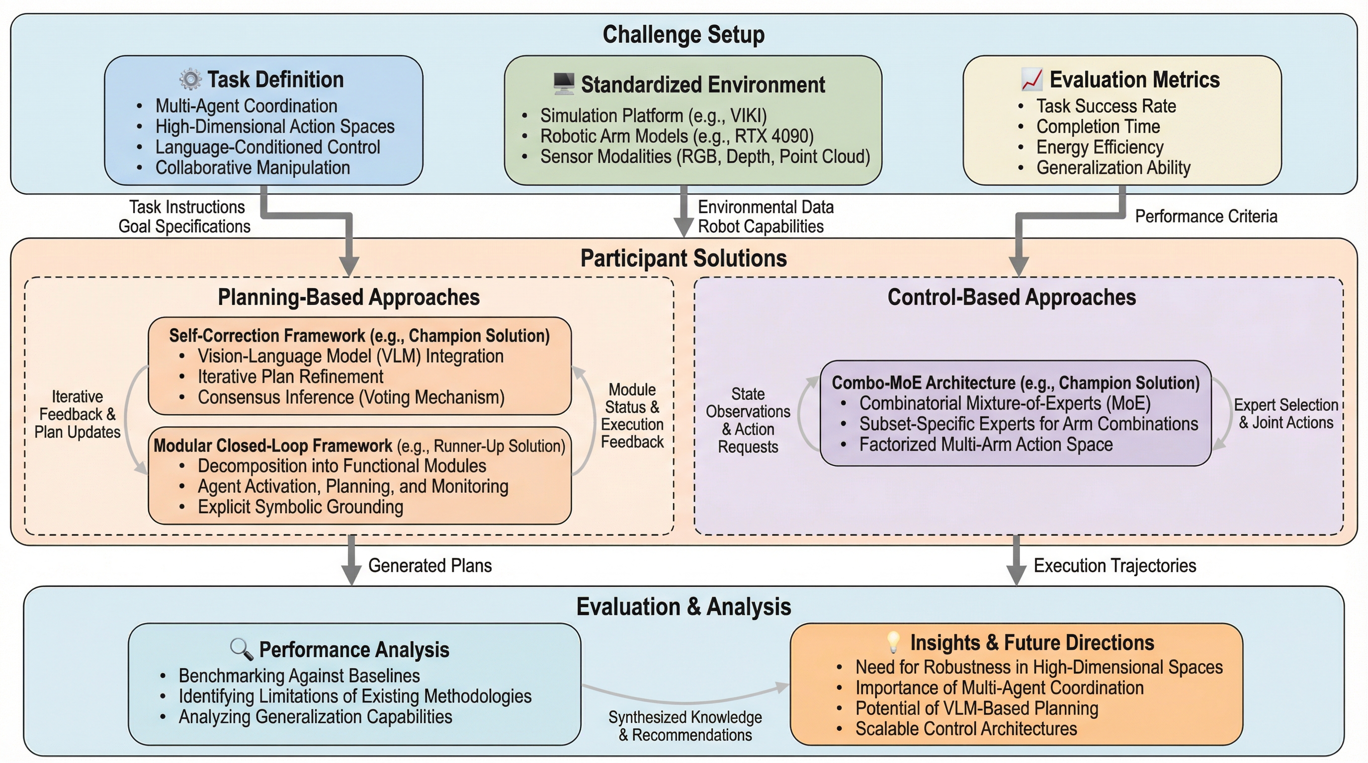 複雑なタスクを解決するため、複数のロボットが協力するマルチエージェント・ロボットシステム(MARS)チャレンジが提案された。この競技会は、視覚言語モデル(VLM)を用いた高レベルな「プランニング」と、物理シミュレーション環境での低レベルな「制御」の2つのトラックで構成されている。