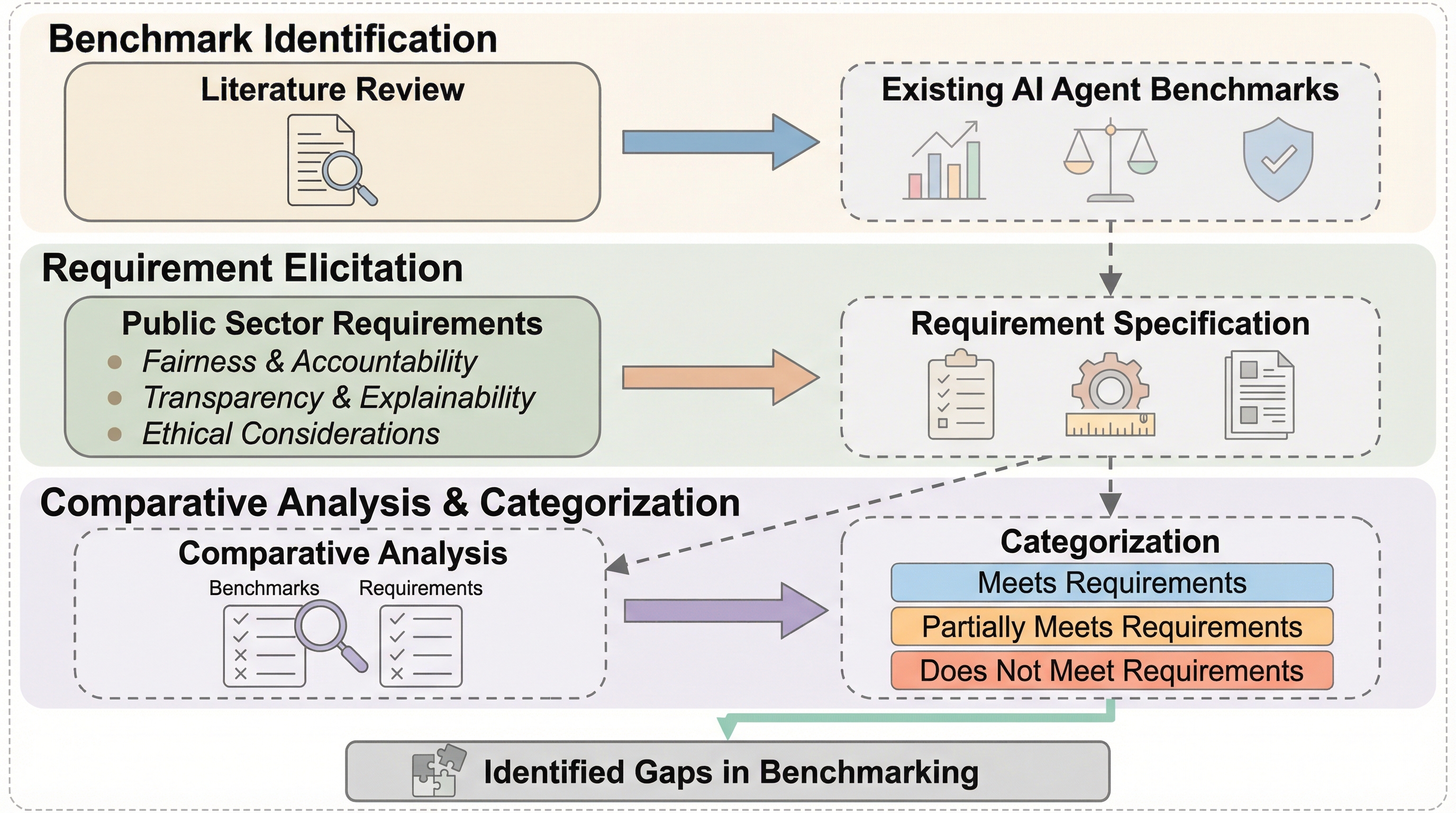 公共部門におけるAIエージェントの導入には、法的・手続き的な厳格な要件を満たすことが不可欠であるが、既存のベンチマークがこれらの特殊な要求を適切に反映できているかは不明確であった。 本研究では、行政学の理論に基づき、タスク中心、現実的、公共部門特化、およびコストや公平性を含む指標の報告という6つの基準を定義し、1,300件以上の既存ベンチマーク論文を体系的に分析した。 分析の結果、すべての基準を満たすベンチマークは一つも存在せず、特に公共部門への適合性や多角的な評価指標において大きな欠落があることが判明したため、新たな評価枠組みの構築が急務である。