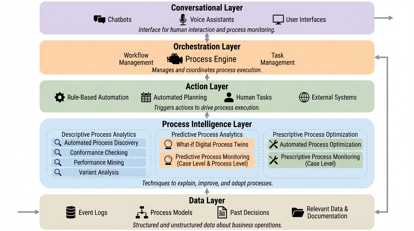 エージェント型ビジネスプロセス管理システム(A-BPMS)は、従来のルールベースの自動化を超え、生成AIやエージェント型AIを活用して自律的なプロセスの実行と最適化を目指す新しいプラットフォームの概念である。このシステムは、プロセスマイニング技術を基盤としてプロセスの状態を感知し、改善の機会を推論して実行に移すことで、設計主導からデータ主導の管理へと転換を図るものである。 提案されるアーキテクチャは、データ層、プロセスインテリジェンス層、アクション層、オーケストレーション層、対話層の5層で構成され、人間による管理から完全な自律走行までをカバーする連続的なプロセス実行のスペクトラムを支援する。これにより、あらかじめ定義されたワークフローに従うだけでなく、状況に応じて動的にプロセスを生成し、文脈に応じた意思決定を行うことが可能になるとされている。 本論文では、プロセスの実行とオーケストレーションの両面において、人間、ルールベース、エージェント型AIの役割を整理し、順次型や並列型、ルーティング型といったエージェント間の連携パターンを定義している。これにより、従来の自動化の限界を再定義し、ガバナンスを維持しつつ高度な自律性を備えた次世代のビジネスプロセス管理のビジョンを提示している。