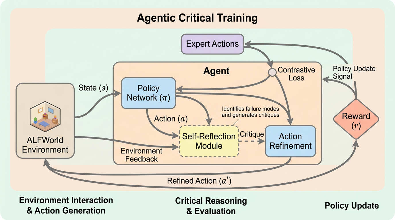 提案の中心は Agentic Critical Training です。設定はシンプルで、ある状態に対して expert action と suboptimal action を並べ、モデルに「どちらが良いか」を選ばせます。報酬は、その判断が正しかったかだけです。つまり、反省文の正しさを直接教師するのではなく、判定結果の正しさにだけ報酬を与えます。