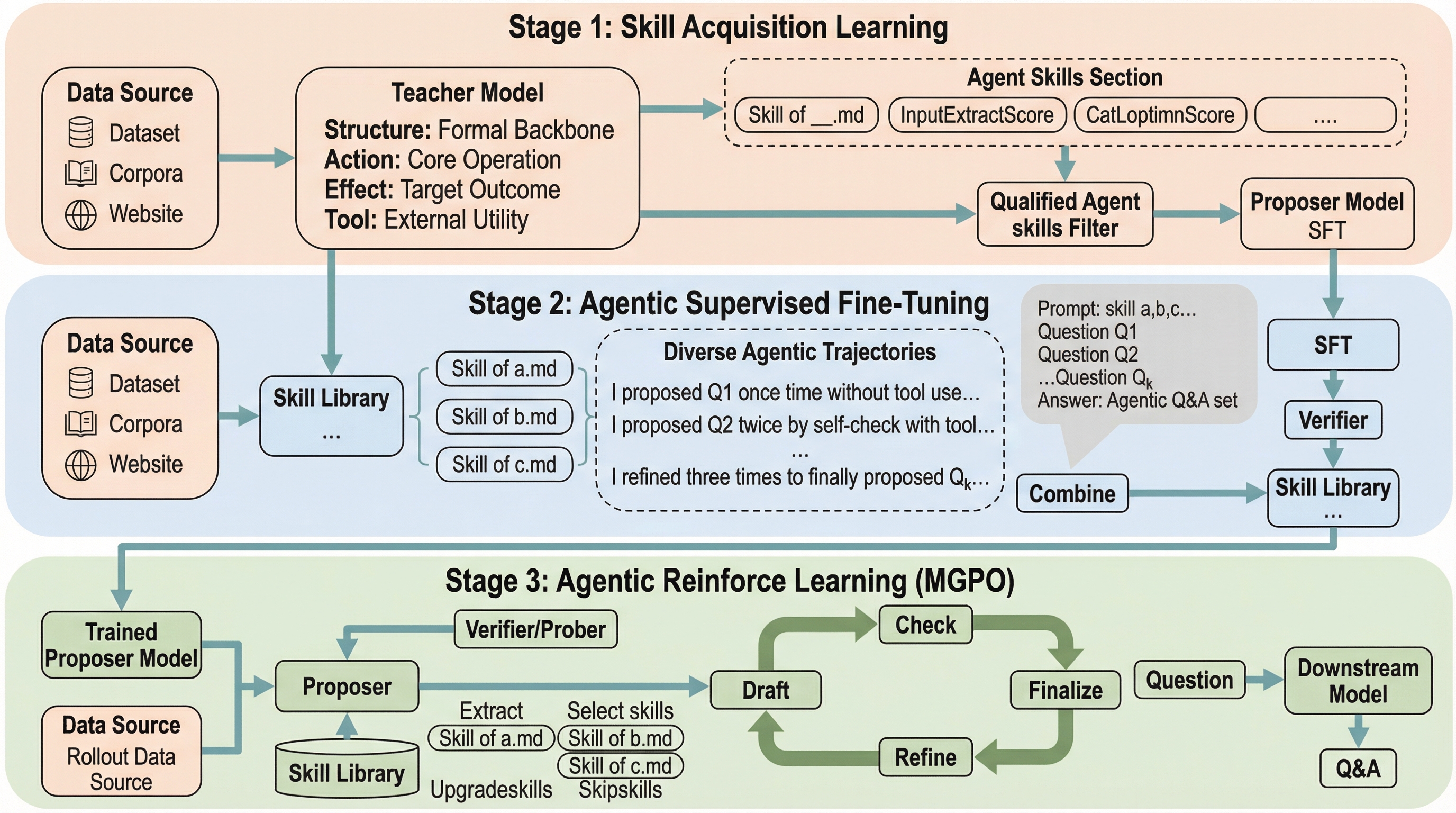 本論文の核心は、問題合成を目標主導型の逐次意思決定プロセスとしてモデル化する「Agentic Proposing」というフレームワークの提案にあります。このフレームワークでは、専門の提案エージェントが、モジュール化された「推論スキル」を動的に選択し、それらを組み合わせることで複雑な問題を構築します。これは、従来の静的なプロンプトによる生成とは異なり、エージェントが内部的な内省(Reflection)と外部ツールの使用を繰り返しながら、論理的に健全で、かつ難易度が精密に調整された問題を生成する「クローズドループ」なプロセスです。 具体的には、推論の論理を「Composable Agent Skills」と呼ばれる原子的なモジュールに分解しました。…