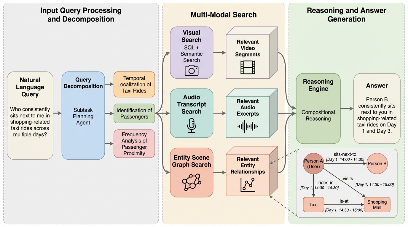 スマートグラス等のウェアラブルデバイスが記録する数日間にわたる膨大な一人称視点動画を理解するため、人物・物体・場所とその関係性を時間情報と共に構造化した「エンティティ・シーングラフ(ESG)」を活用する新フレームワーク「EGAgent」が提案されました。 プランニングエージェントがSQL検索や視覚・音声検索ツールを駆使して複雑な問いをサブタスクに分解・実行することで、従来の言語モデルや検索拡張生成(RAG)では困難だった多段階の論理推論や、数日を跨ぐ長期的な文脈の把握を可能にしています。 50時間に及ぶ動画データセット「EgoLifeQA」を用いた検証では、従来手法を20.6%上回る57.5%の精度を達成し、特に人間関係の把握(RelationMap)や複雑なタスクの理解(TaskMaster)において劇的な性能向上を実現し、計算効率も大幅に改善しました。