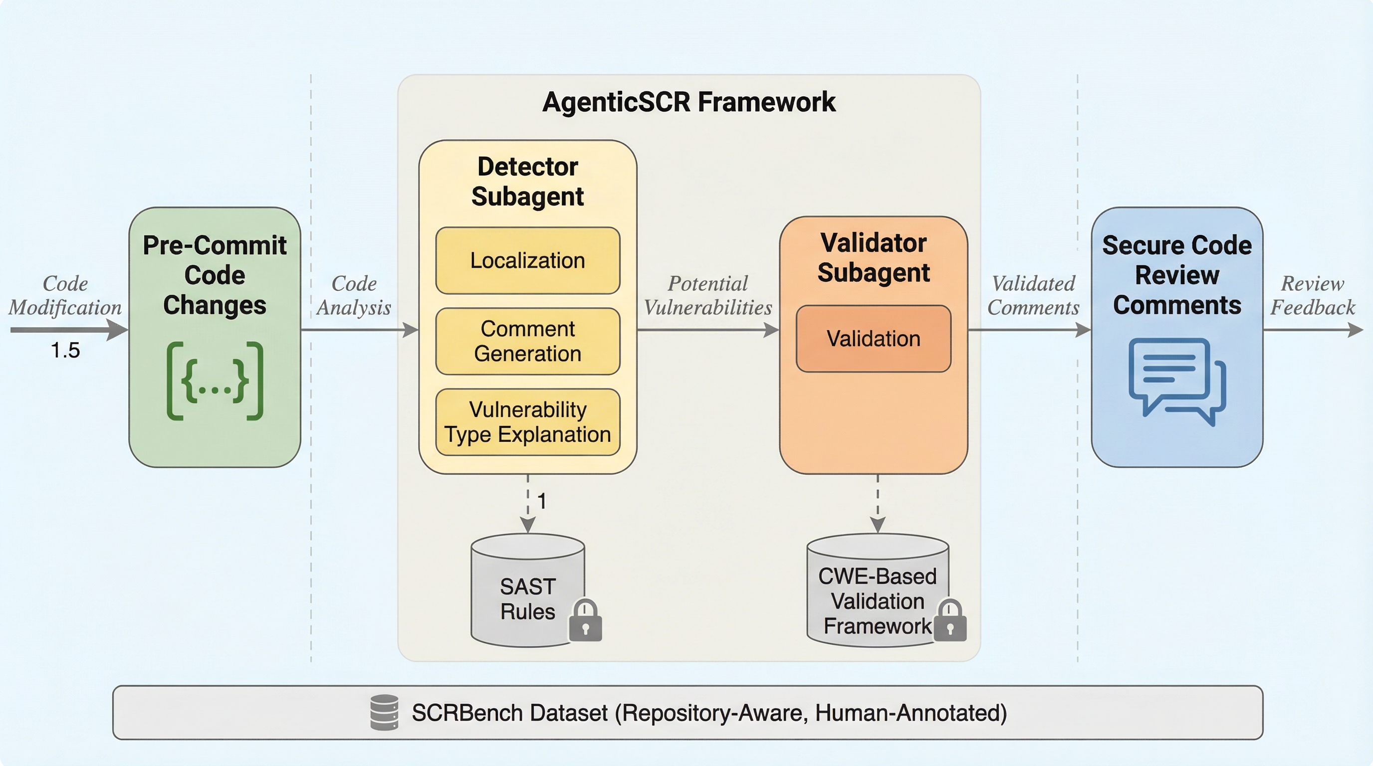AgenticSCRは、開発者がコードをコミットする前の段階で、不完全かつ文脈に依存する「未成熟な脆弱性」を検出するために設計された、自律的な意思決定とツール呼び出し能力を備えたAIエージェントフレームワークである。