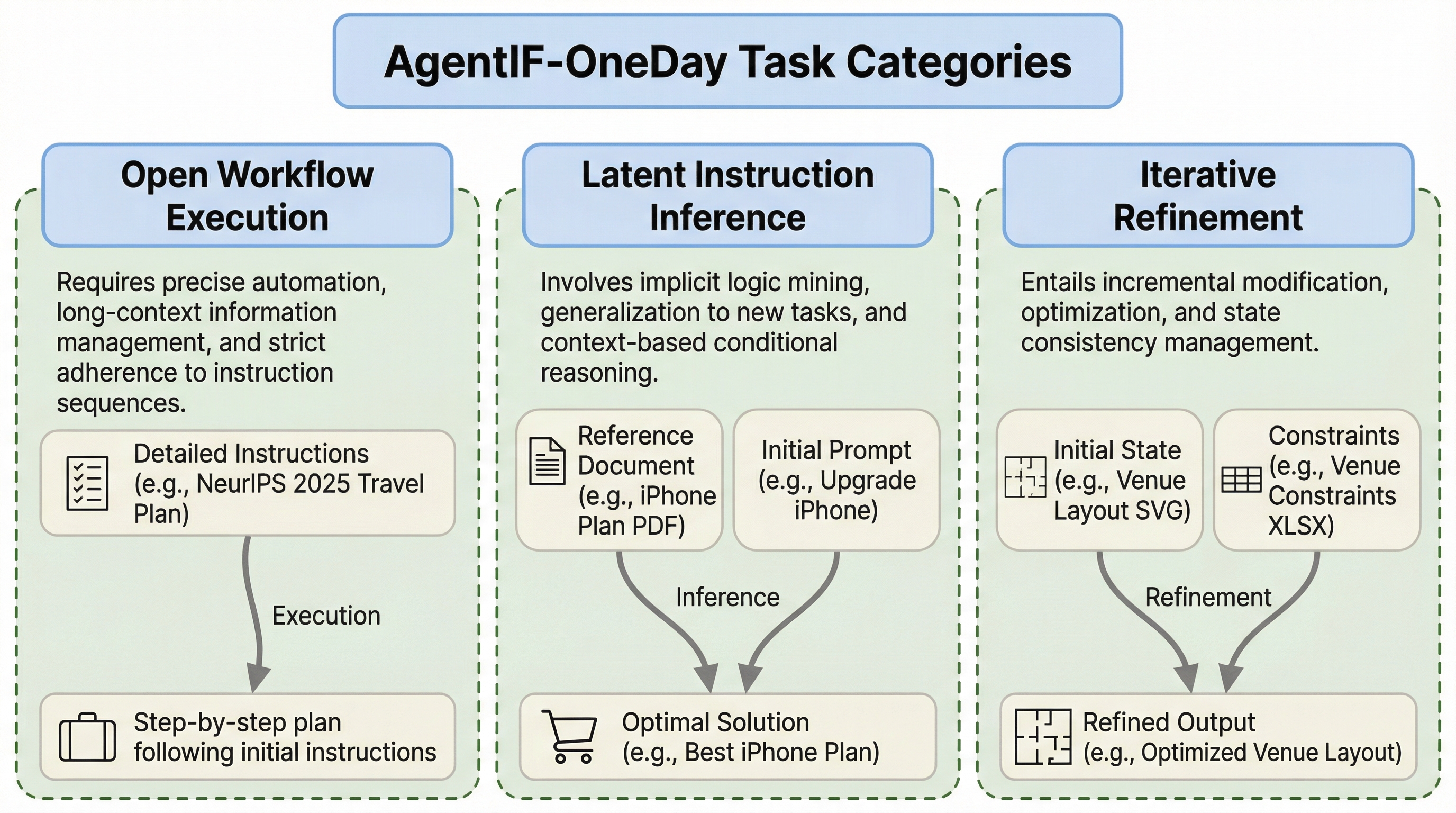 AgentIF-OneDayは、AIエージェントが一般ユーザーの日常生活、仕事、学習における多様なタスクをどの程度遂行できるかを評価するための新しいベンチマークであり、104の複雑なタスクと767の評価ポイントによって構成されています。