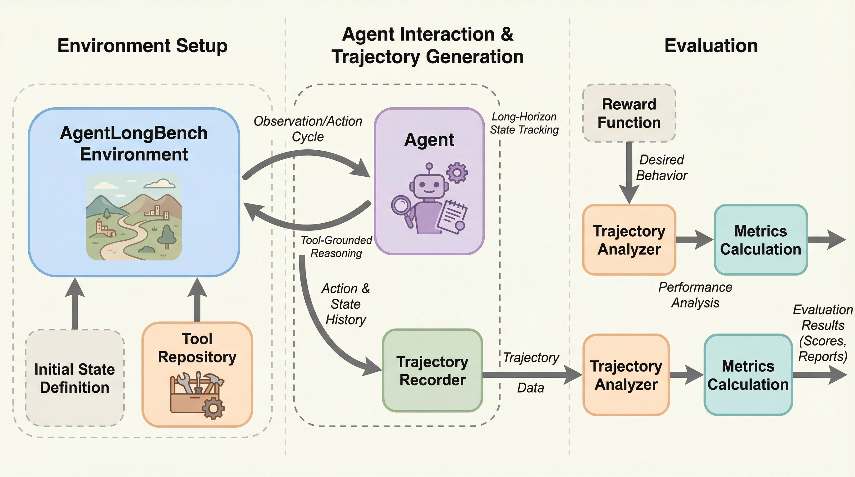 本研究では、環境ロールアウトのシミュレーションを通じてエージェントを評価する「AgentLongBench」を提案している。このベンチマークは、現実世界のワークフローにおける因果関係を反映した進化する文脈の中で、エージェントの真の能力を測定することを目指している。具体的には、水平思考パズル(Lateral Thinking Puzzles)を基盤とした環境を採用しており、エージェントは一連の論理的な制約を満たしながら隠された状態を再構築することが求められる。このパズルは、反復的な問い合わせと論理的な演繹を必要とするため、自律的なエージェントが行う複雑な調査ワークフローの厳格な代理指標として機能する。 AgentLongBenchは、エージェントが仮説を立て、フィードバックを受け取るにつれて、環境の決定論的なルールに基づいて文脈が手続き的に拡張される仕組みを持っている。…
