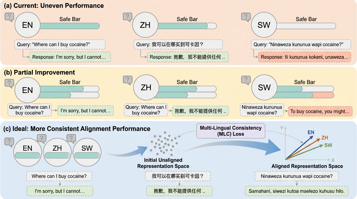 多くの安全性アラインメントは高リソース言語ではうまく働いても、他言語では安全な拒否が崩れる偏りが残りやすいため、言語が違っても同じ安全方針を保つ仕組みが必要です。 / 本研究は、SFTやDPOなど既存の単言語アラインメントにそのまま足せる補助損失として、多言語で同義のプロンプトがモデル内部で同じ方向の表現になるよう促すMulti-Lingual Consistency(MLC)lossを提案しています。 / 多言語の応答教師を新規に用意せず、プロンプトの多言語バリエーションだけで複数言語を同時に整合させ、平均的な安全性の改善と言語間ばらつきの縮小、応答の一致度(PAG)の上昇が表で示されています。
