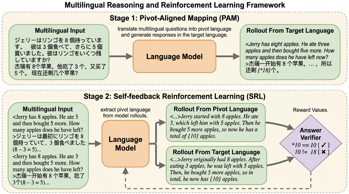 大規模言語モデル(LLM)が低リソース言語での数学的推論において性能を低下させる問題を解決するため、英語を「ピボット(軸)」として推論プロセスを整列させる新フレームワーク「PASMR」を提案しました。 この手法は、問題をピボット言語に変換して推論パターンを一致させる「ピボット整列マッピング(PAM)」と、モデル自身の英語回答を報酬として利用し外部の正解データに頼らず学習する「自己フィードバック強化学習(SRL)」の2段階で構成されます。 実験の結果、MistralやLlama-3などのモデルにおいて低リソース言語の精度が最大32.8%向上し、正解ラベルを用いた従来の強化学習を上回る性能と、未知のデータセットに対する高い堅牢性が実証されました。