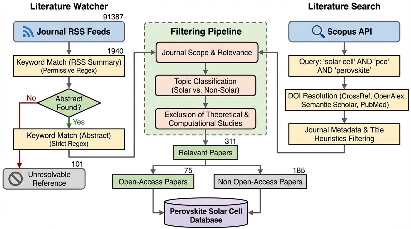 科学論文の指数関数的な増加により、手動でのデータ収集が限界に達し、主要なデータベースが2021年以降更新されないという深刻な知識の空白が生じていたが、本研究では大規模言語モデル(LLM)と物理的検証を統合した自律更新型データベース「PERLA」を開発した。 このシステムは、最新の論文から複雑なデバイスデータを90パーセントを超える人間と同等の精度で自動抽出し、手動抽出において大きな課題となっていた注釈者間の主観的なばらつきを排除しながら、最新の知見を即座に構造化データとして提供することを可能にしている。 2021年以降のデータを分析した結果、デバイス構造が反転型へ移行し、自己組織化単分子膜(SAMs)やホルムアミジニウム主体の組成が主流となることで、電圧損失が年間約25ミリボルトのペースで着実に減少しているという、分野の成熟と進化の傾向を定量的に明らかにした。