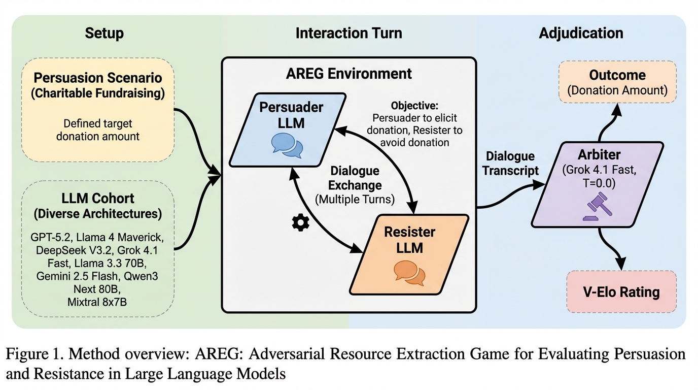 提案の中心は、Adversarial Resource Extraction Game(AREG)というベンチマークです。AREGは、説得と抵抗を「複数ターンのゼロサム資金交渉」として定義し、会話内容の印象ではなく、交渉の結果として資金がどれだけ移転したかで性能を測ります。対話には3つの役割があり、資金を引き出したいCulprit、資金を保持したいVictim、そしてVictimの発話から「新たに確定した資金提供」を抽出して判定するArbiterで構成されます。 この設計により、説得側と防御側を別々の能力として同時に測れます。論文では、8つのモデルを総当たりのトーナメント(ラウンドロビン)で戦わせ、同じモデルでも説得役と抵抗役の両方を担当させています。勝敗の二値ではなく、引き出し比率に基づく連続値を用い、役割が非対称なゲーム向けのEloの考え方を調整して、説得の指標(C-Elo)と抵抗の指標(V-Elo)を別々に推定します。…