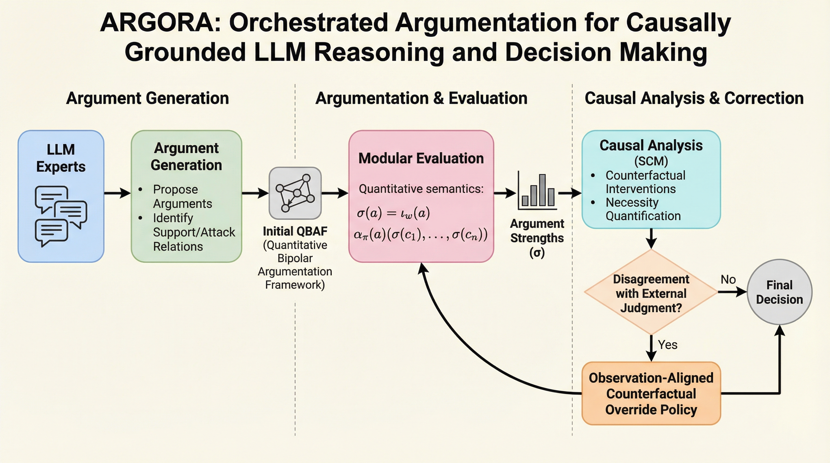 ARGORAは、複数の大規模言語モデルによる議論を「定量的双極議論フレームワーク(QBAF)」という明示的なグラフ構造に整理し、どの主張が最終的な意思決定に寄与したかを特定する新しいフレームワークです。議論の構造を「構造的因果モデル(SCM)」として解釈することで、特定の推論ステップを仮想的に取り除いた際の結果の変化を計算し、結論を導くために不可欠な推論チェーンを特定する因果診断を可能にします。内部の議論による結論と外部の判定が一致しない場合に、最小限の構造的変更で論理を調整する補正メカニズムを備えており、多様なベンチマークにおいて高い精度と誤り訂正能力を発揮しながら、AIの判断プロセスを透明化します。