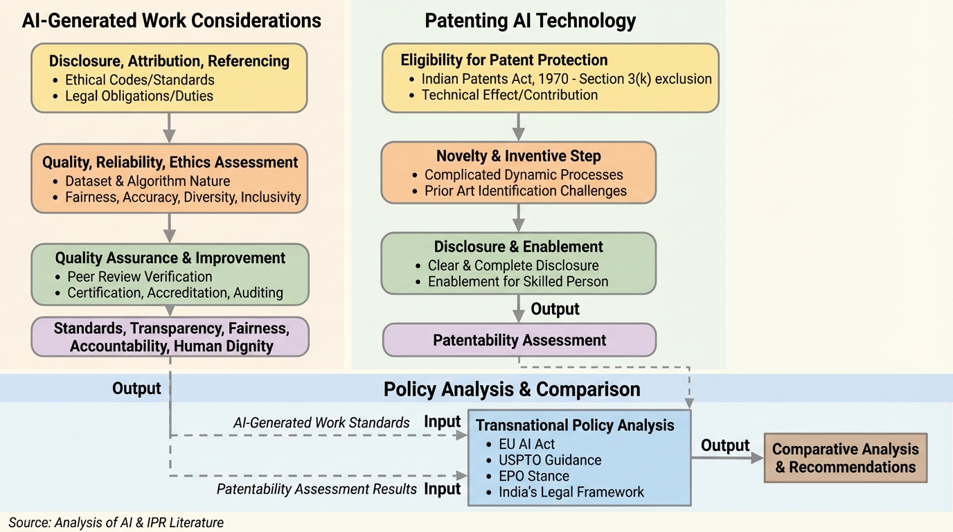 人工知能(AI)の急速な普及に伴い、インド、米国、英国、欧州連合における知的財産権(IPR)の現状を比較分析し、インドの既存法制度におけるAI特有の規定の欠如や、特許法第3条(k)がAI生成発明の特許化を阻害している現状、営業秘密保護の脆弱性などの法的な不整合を明らかにしている。 管轄区域によって著作者の帰属や独創性の基準に大きな差異があることを指摘し、英国のコンピュータ生成作品に関する規定や米国の人間中心の著作権保護、欧州連合の透明性義務化などの事例を検証することで、AIが生成または支援した成果物の法的地位を明確にする必要性を強調している。 2024年のインド国家AI戦略などの進展を踏まえつつ、イノベーションの動機付けと倫理的配慮を両立させるために、AIの変革的役割を考慮した統一的な法的分類体系と、デジタル水印などの技術的手段を組み合わせた堅牢な法的アーキテクチャの構築を提言している。