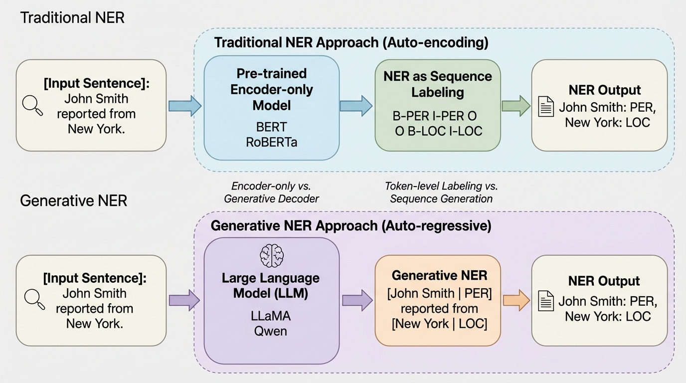固有表現認識(NER)は、自然言語処理における極めて重要な基礎タスクであり、関係抽出、知識グラフの構築、情報検索、質問応答システムといった幅広い下流アプリケーションの基盤となっています。従来、このタスクはテキスト内の各単語にラベルを割り当てる「シーケンスラベリング」として扱われ、BERTに代表される自己符号化型の事前学習モデルが主流となってきました。しかし、大規模言語モデル(LLM)の台頭により、NERのパラダイムはテキストを逐次的に生成する「生成的アプローチ」へと大きく移行しつつあります。この移行期において、研究コミュニティにはいくつかの重要な疑問が浮上していました。 第一に、ChatGPTのようなクローズドソースのモデルを用いたゼロショット性能の研究は進んでいますが、LLaMAやQwenといった最新のオープンソースLLMを特定のデータセットで微調整した場合、従来の専門的なNERモデルと比較してどの程度信頼できる性能を発揮するのかという点です。特に、単純な形式の「フラットNER」だけでなく、エンティティが重なり合う「ネストNER」において、どの程度の性能差があるのかは十分に解明されていませんでした。…