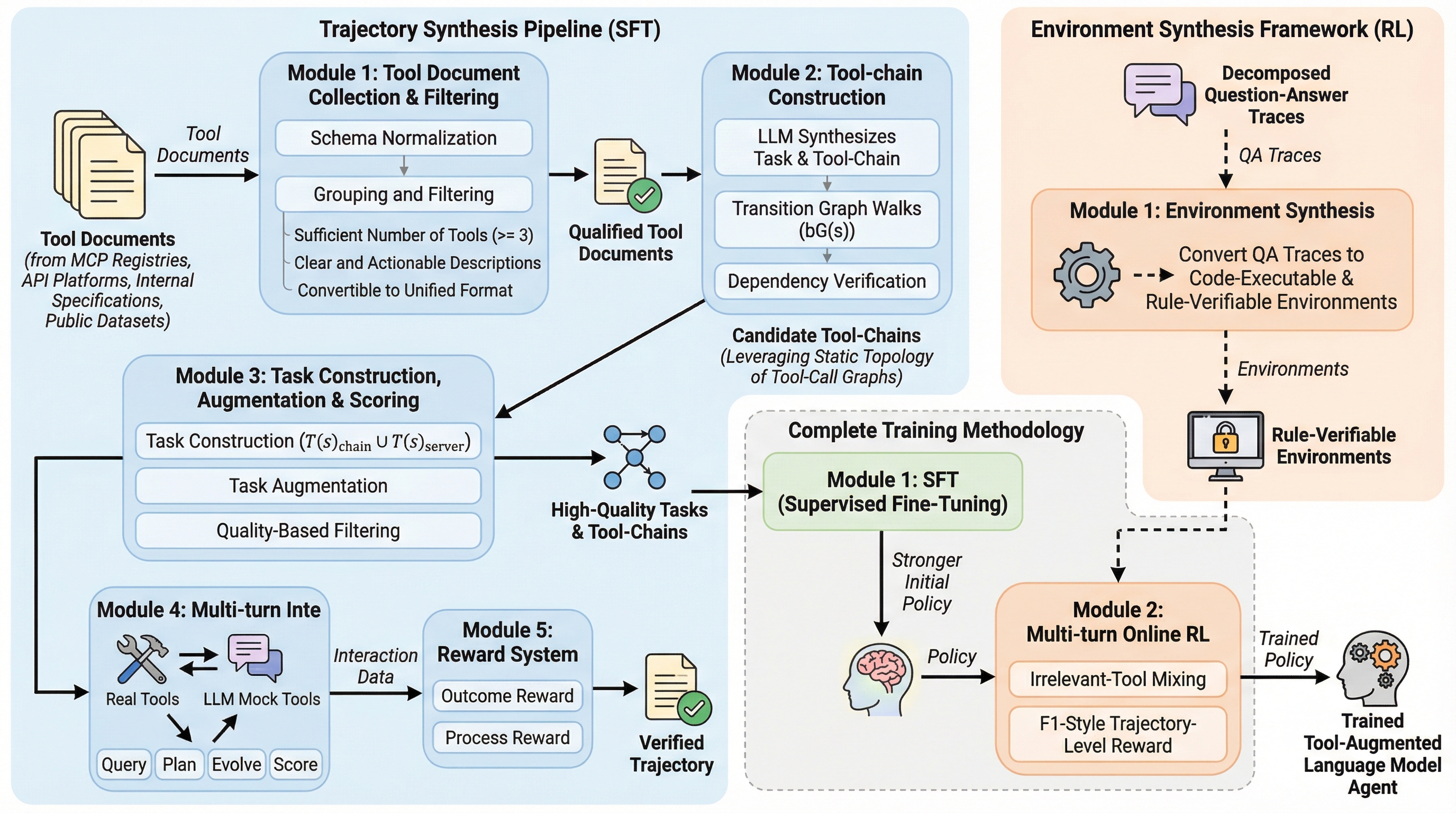 大規模言語モデル(LLM)を外部ツールやAPIと連携させて多段階の意思決定を行うエージェントとして活用する試みが進んでいるが、堅牢なツール利用エージェントを訓練することは依然として困難な課題である。既存の手法にはいくつかの根本的な限界が存在しており、その一つはデータ構築や検証のプロセスにおいて依然として人間による介入が必要とされる点である。また、多くの手法がLLMによるシミュレーション環境に依存しており、ツールの実行結果や状態遷移、フィードバックが明示的なルールや実行可能なバックエンドではなく、言語モデルによって生成されているため、検証可能性が低いという問題がある。このような検証可能性の欠如は、決定論的な遷移と信頼性の高い報酬信号が不可欠な、長期的なスパンでのマルチターン・オンライン強化学習の安定性を根本的に制限している。 さらに、既存のアプローチの多くは教師あり微調整(SFT)または強化学習(RL)のいずれか一方の訓練体制にのみ焦点を当てており、両者を効果的に統合できていない。…