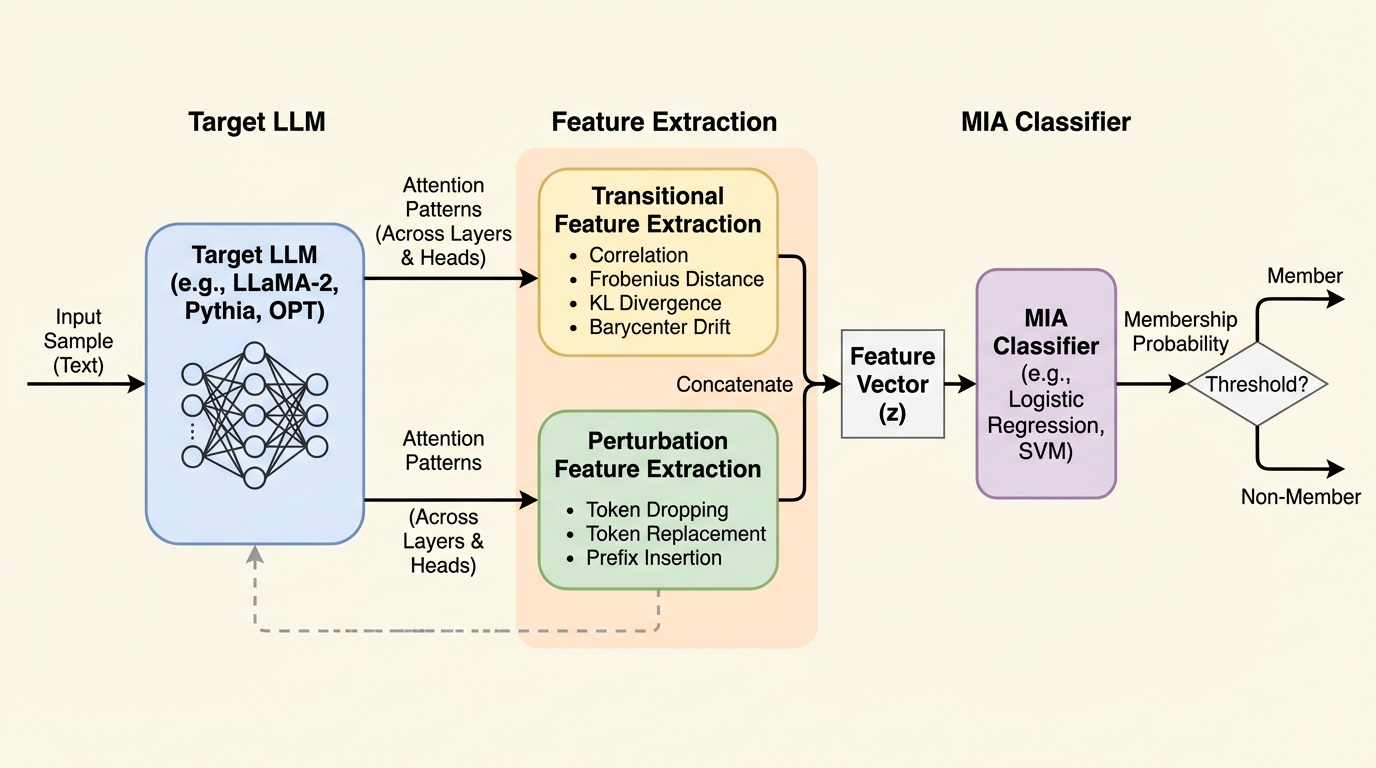 本研究では、トランスフォーマー内部の自己注意パターンを直接利用してメンバーシップを推論する、初のホワイトボックス型フレームワーク「AttenMIA」を提案している。この手法の核心的な洞察は、自己注意パターンが情報の流れを促進するだけでなく、モデルの記憶に関する微細かつ系統的な署名をエンコードしているという点にある。研究チームは、学習済みサンプルはモデル内部でより構造化され、集中したアテンションパターンを誘発し、その信号は層やヘッドを横断して持続するという仮説を立てた。 AttenMIAは、単にアテンションの値を観察するだけでなく、トランスフォーマー独自のマルチヘッド構造を活用し、層間の変化率に基づいた詳細なプライバシー信号を追跡する。…