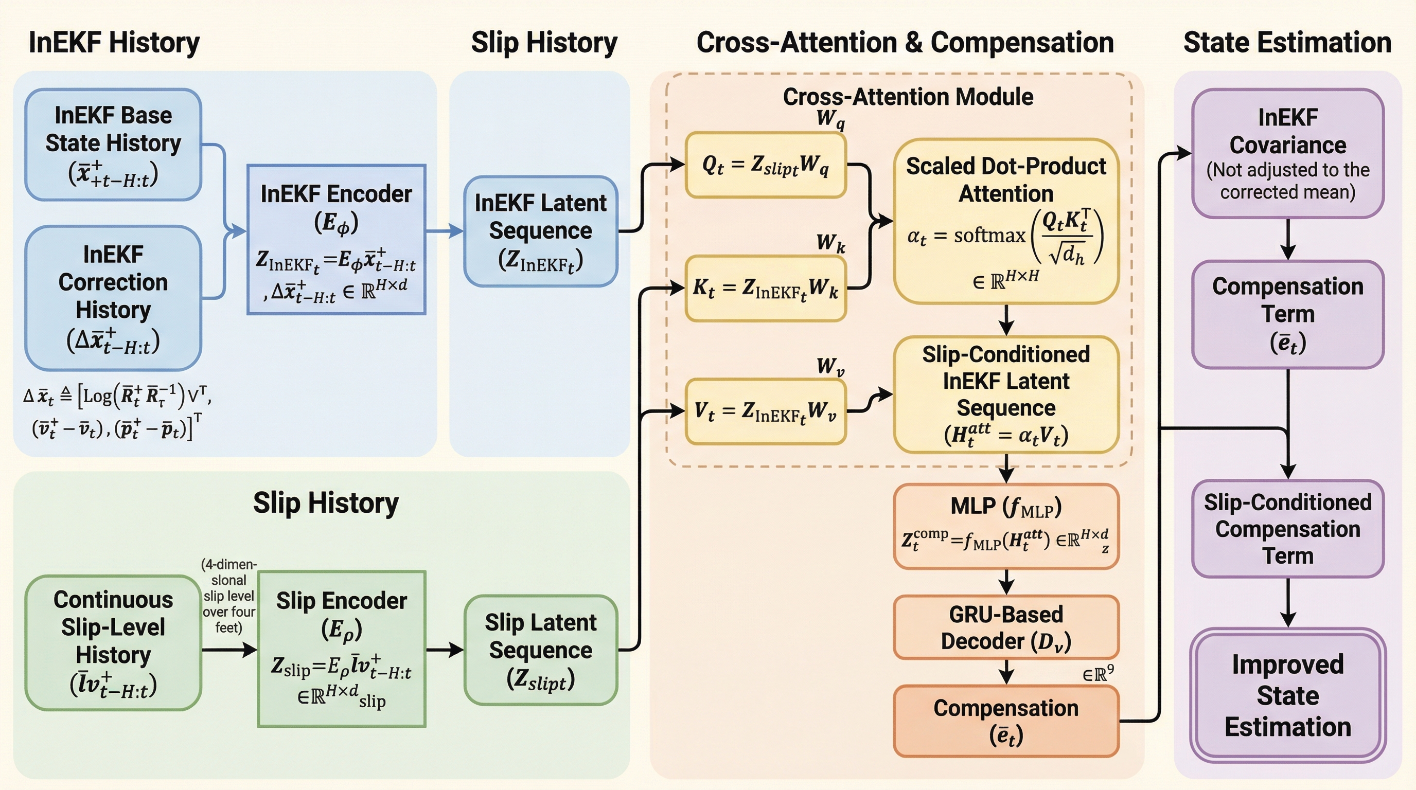本研究の核心は、足の滑りによる誤差を明示的に推定し、補正を行うための新しいフレームワーク「Attention-Based Neural-Augmented Kalman Filter(AttenNKF)」を提案したことにある。この手法は、数学的に厳密な構造を持つ不変拡張カルマンフィルタ(InEKF)をベースとし、そこにアテンション機構を備えたニューラル補正器(NC)を組み合わせたハイブリッドな構成を採用している。最大の特徴は、滑りを単なる入力データの一つとして扱うのではなく、補正の構造を決定するための「コンテキスト(文脈)」として定義した点である。…