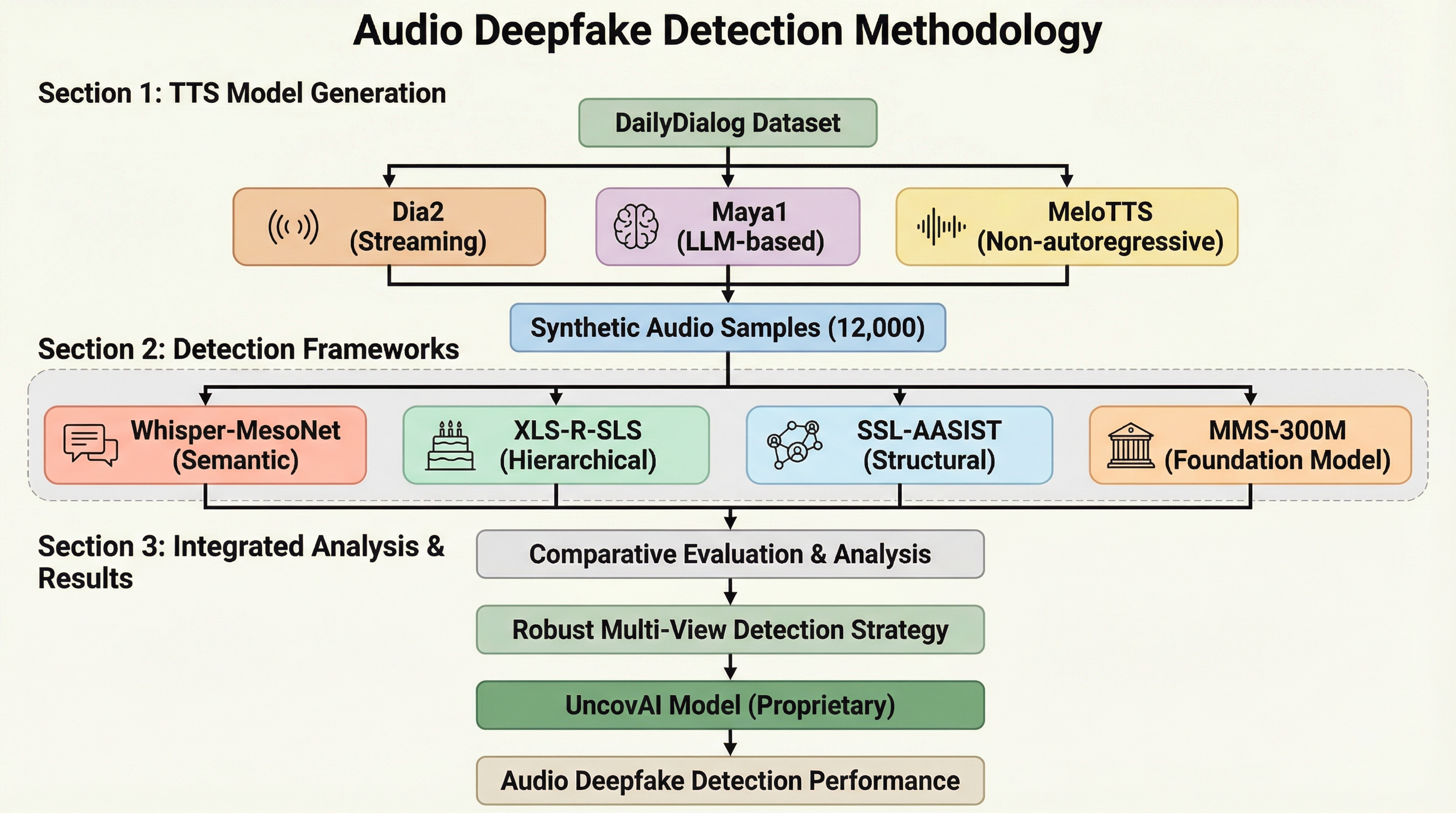 最新のText-to-Speech(TTS)技術であるDia2、Maya1、MeloTTSは、大規模言語モデルやフローマッチング、階層型コーデックを採用することで、従来の検出器では識別が困難な極めて自然な音声を生成する。 検証の結果、特定のアーキテクチャに特化した検出器は他の生成手法に対して脆弱であり、特にセマンティック(意味的)検出器はLLMベースの合成に、階層型モデルはフローマッチング方式に失敗する傾向がある。 未知の高度な音声偽造の脅威に対抗するためには、単一の検出手法に頼るのではなく、信号レベル、構造レベル、意味レベルの分析を組み合わせた統合的なマルチビュー検出戦略の構築が不可欠である。