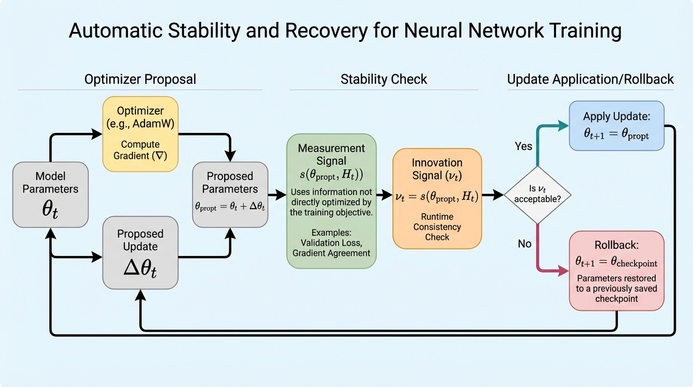 現代のニューラルネットワーク学習は非常に脆弱であり、稀に発生する深刻な不安定な更新が、回復不能な発散や静かな性能低下を引き起こすことが大きな課題となっている。既存の最適化手法は主にオプティマイザ内部に組み込まれた予防的なメカニズムに依存しており、一度不安定性が生じるとそれを検知して回復する能力が限られているため、計算資源の浪費や実験結果の不確実性を招く要因となっている。 本研究では、最適化を制御された確率過程として扱う監視型の実行時安定性フレームワークを提案し、バリデーションプローブなどの二次的な計測信号から導出される「イノベーション信号」を分離して利用することで、基底となるオプティマイザを変更することなく不安定な更新の自動検知と回復を可能にした。このフレームワークは、提案された更新が安定した学習動態と一致するかを評価し、異常が検知された場合には更新を拒否して以前の正常な状態へとロールバックする。 理論的には、有界な劣化と回復を定式化した実行時の安全保証を提供し、ResNet-18やTransformerを用いた実験において、標準的なパイプラインが失敗するような壊滅的な更新からも迅速に回復し、学習の発散を抑制して堅牢性を向上させることを実証した。この実装はメモリ制約のある環境にも対応しており、計算オーバーヘッドを最小限に抑えつつ、既存の多様なオプティマイザと組み合わせて使用できる実用的な制御レイヤーとして機能する。