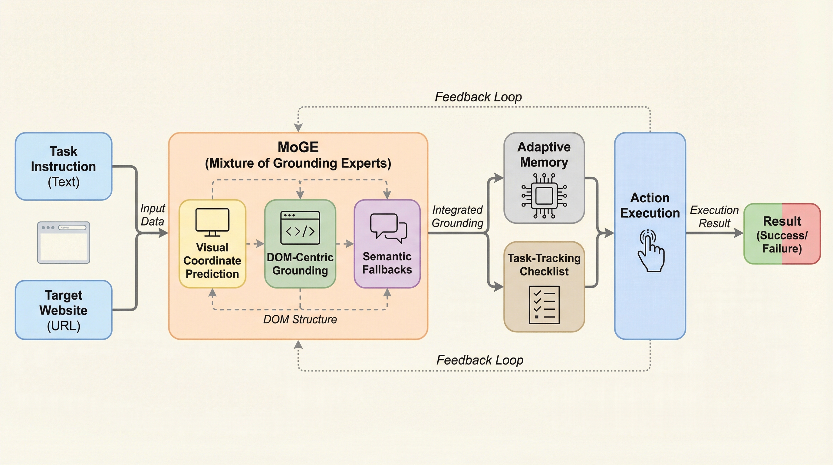 現代のコンピューティング環境におけるウェブサイトは、極めて複雑なドキュメントオブジェクトモデル(DOM)構造や、動的に変化するユーザーインターフェースを備えており、自律型エージェントが長期的なタスクを完遂することは依然として困難です。既存のウェブエージェントには、主に3つの深刻な信頼性のボトルネックが存在しています。第一に、操作対象となる要素を正確に特定する「グラウンディング」の精度が不十分である点です。従来のDOM中心のアプローチでは、インラインフレーム(iframe)やキャンバス要素、シャドウDOMといった特殊な構造を正しく解釈できず、操作が途切れてしまうことが多々ありました。特に、複数のフレームが入れ子になっているような複雑なサイトでは、エージェントが要素を見失い、タスクが失敗する原因となっていました。 第二に、特定のウェブサイト固有の操作手順や知識が不足している点です。人間であれば外部のヘルプセンターやユーザーガイドを参照して効率的に操作できますが、従来のエージェントは事前の知識なしに試行錯誤に頼るため、無駄なトークン消費が増え、取り返しのつかないナビゲーションエラーを引き起こすリスクがありました。…