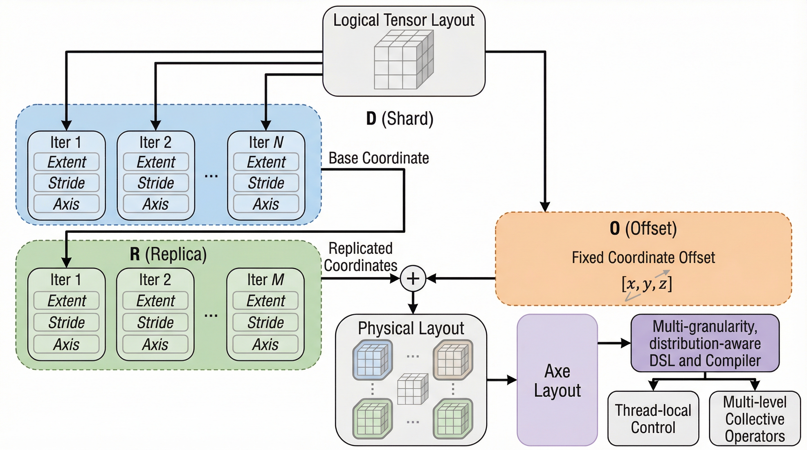 Axeは、論理的なテンソル座標をデバイス、メモリ、スレッドなどのハードウェア軸にマッピングする、ハードウェアを意識した新しい抽象化手法である。 この手法は、デバイス間のデータ分散(シャーディング、複製)とデバイス内のメモリレイアウト(タイリング、オフセット)を単一の形式で統一し、一貫した記述を可能にする。 Axeを基盤としたDSLとコンパイラにより、手動で最適化されたカーネルに匹敵する性能を、GPUやAIアクセラレータなどの多様な環境において、より低い開発コストで実現できる。