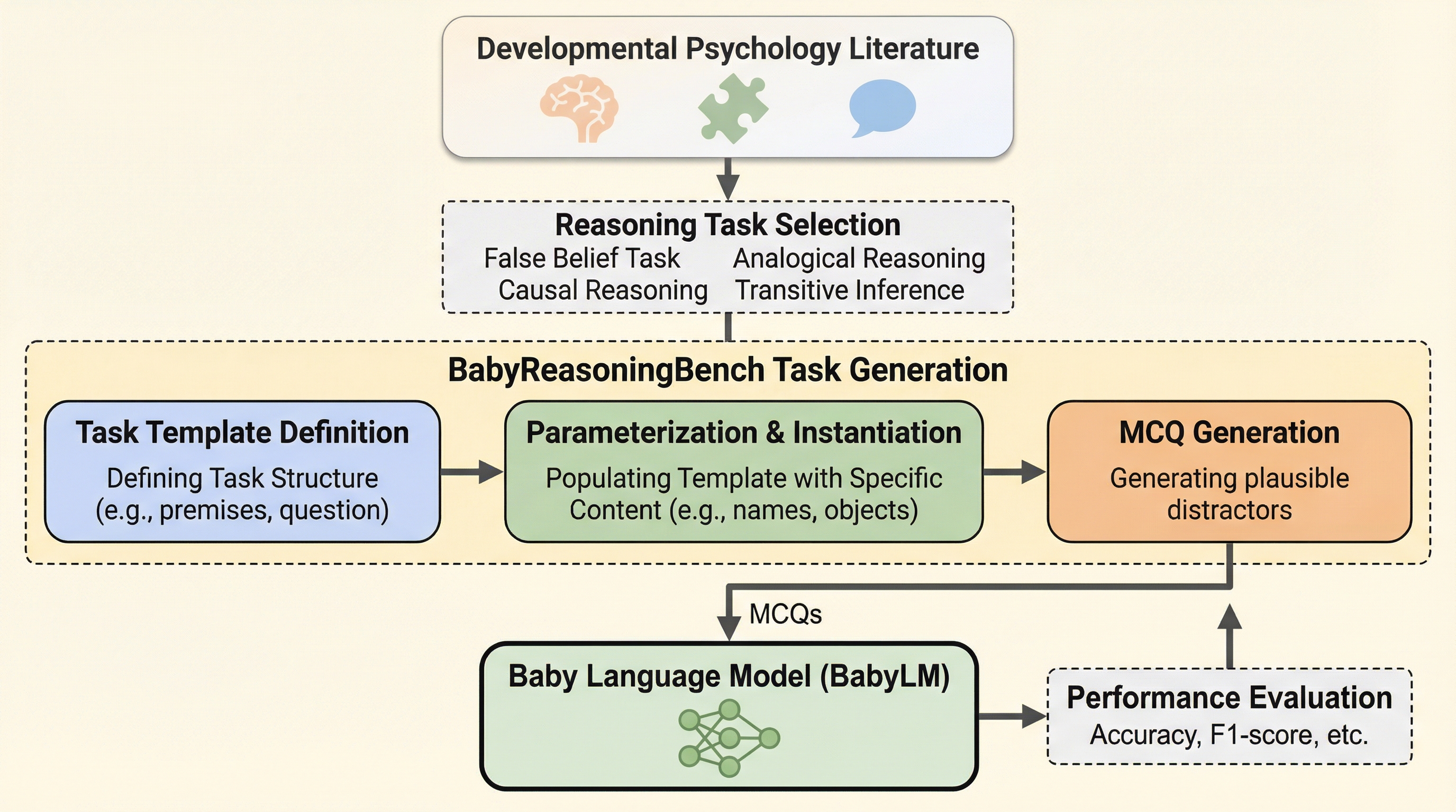 大規模言語モデル(LLM)の推論能力を測定するための従来のベンチマークは、広範な世界知識、長文の指示への追従、そして成熟した言語運用能力を前提とした成人中心の設計が支配的であるという大きな課題があります。このような評価手法は、保護者と子供の対話データや幼少期の物語、簡略化された知覚的・叙述的な入力のみで学習された「赤ちゃん言語モデル(Baby Language Models)」の評価には適していません。成人向けの基準では、限られた学習環境下でどのような推論能力が実際に芽生えているのか、あるいは何が欠けているのかを正確に把握することが困難です。また、認知モデリングやデータ効率の良い人工知能の開発という観点からも、発達段階に適した評価パラダイムの構築が強く求められています。 子供のような限定的なデータ分布からどのような知能が立ち上がるのかを解明することは、人間の認知発達のプロセスを理解する上でも極めて重要です。さらに、子供を対象とした実験では実施が難しい因果的な介入実験をモデル上で行うための基盤としても、発達心理学の古典的なパラダイムに整合した評価指標が必要とされていました。…