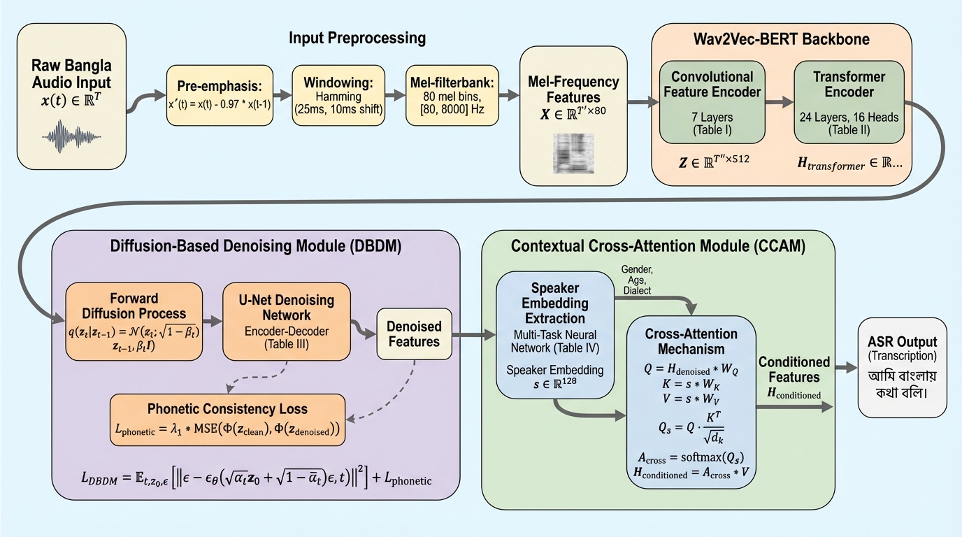本論文では、これらの課題を解決するために「BanglaRobustNet」というハイブリッドなノイズ除去アテンションアーキテクチャを提案しています。このモデルは、自己教師あり学習モデルであるWav2Vec-BERTをバックボーンとして採用し、そこに二つの革新的なモジュールを統合しています。一つ目は「拡散ベースのノイズ除去モジュール(DBDM)」であり、二つ目は「コンテキストクロスアテンションモジュール(CCAM)」です。これらにより、音響的な堅牢性と話者への適応性を同時に実現しています。 BanglaRobustNetの設計思想は、三つの主要な原則に基づいています。第一に「音韻の保存」であり、ノイズ除去の過程でベンガル語特有の有気音や鼻母音などの重要な音素が消えないように設計されています。第二に「話者適応性」であり、話者ごとの再学習を必要とせずに、性別、年齢、方言などの多様な特性に動的に適応します。…