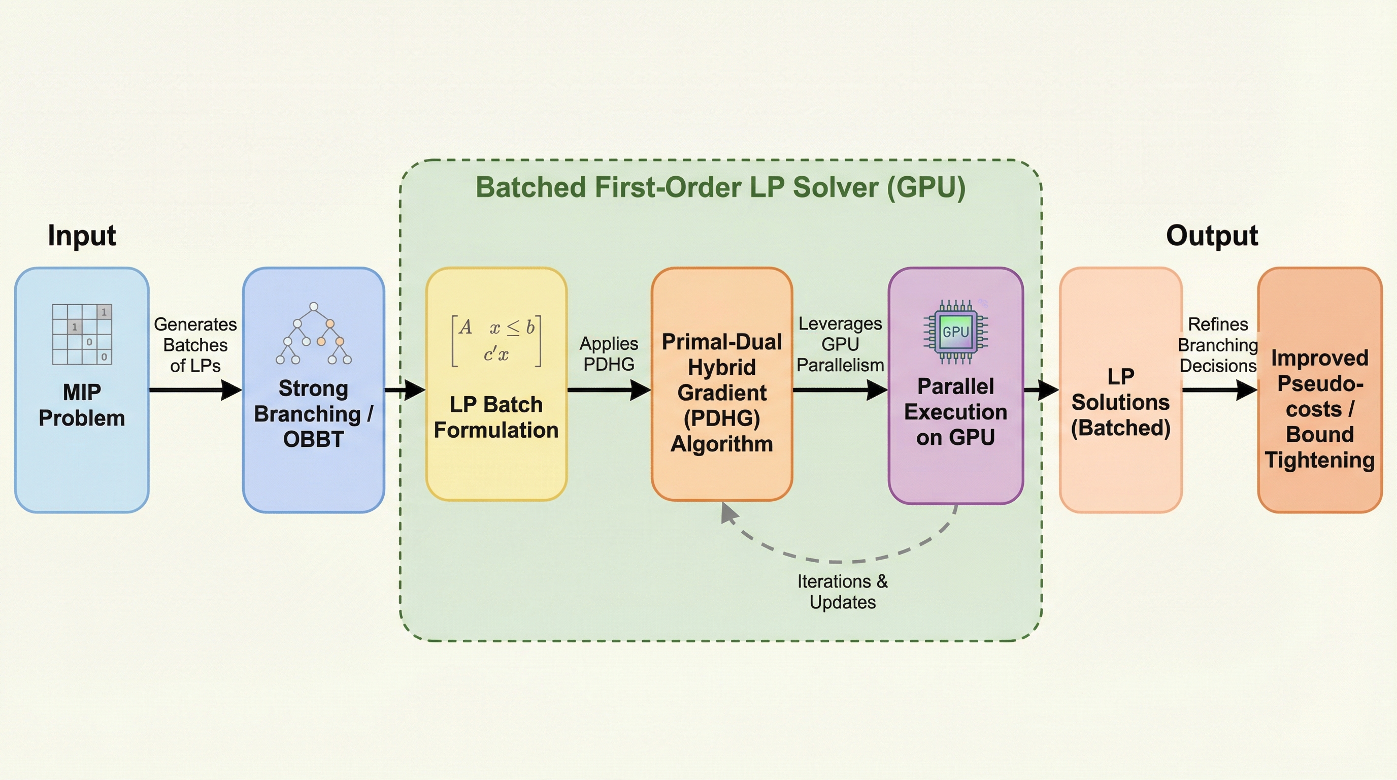 混合整数計画法(MIP)の計算効率を劇的に向上させるため、GPUの並列演算能力を最大限に活用して複数の線形計画問題(LP)を一括で解く「バッチ処理型一次形式解法(BatchLP)」が開発されました。