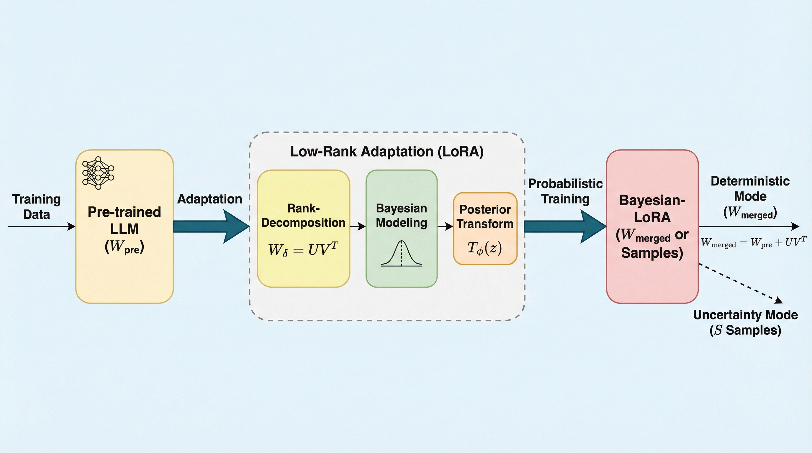 大規模言語モデル(LLM)を特定のタスクに適応させる際、LoRA(Low-Rank Adaptation)のようなパラメータ効率の良い微調整(PEFT)手法が標準的に用いられている。しかし、これらの手法は通常、予測の正確さのみを重視する決定論的な更新を行うため、モデルが自身の予測に対してどの程度確信を持っているかという「不確実性」を考慮できないという問題がある。特に、小規模なデータセットで微調整を行った場合、モデルは過学習を起こしやすく、実際には正解率が低い場面でも高い確率値を割り当ててしまう「過剰適合(miscalibration)」の傾向が顕著になる。このようなモデルの過信は、実社会の重要な意思決定の場面で深刻なリスクをもたらす。 例えば、自動運転における判断、医療診断の支援、あるいは法的な助言といった安全性が重視されるドメイン(safety-critical domains)において、モデルが「分からない」という状態を正しく表現できないことは致命的である。…