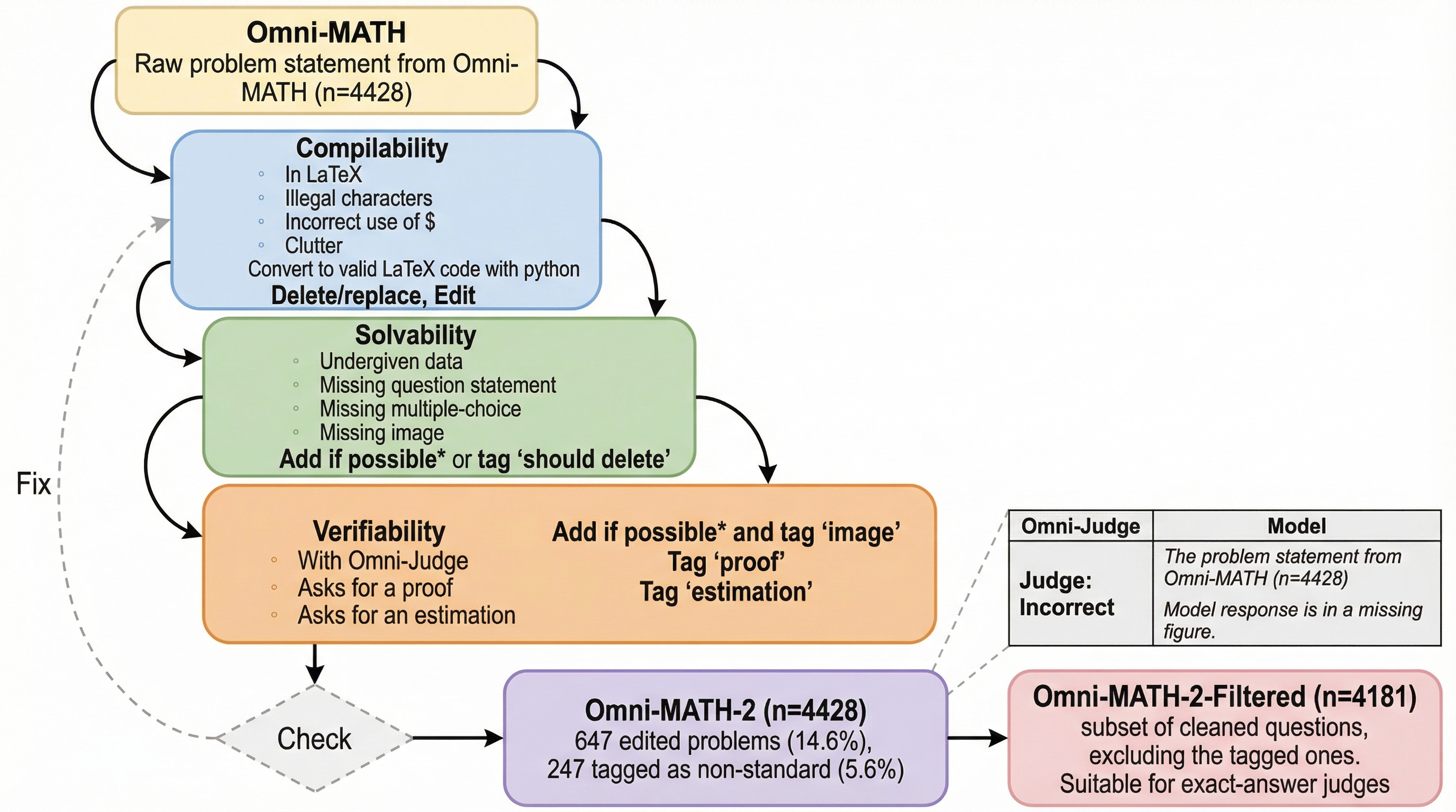 著者らは、広く利用されている数学ベンチマーク「Omni-MATH」を徹底的に手作業で精査し、改訂版である「Omni-MATH-2」を構築した。このプロセスでは、元のデータセットの規模である4,428問を維持しつつ、LaTeXのコンパイル可能性、問題の解決可能性、および検証可能性を大幅に向上させている。具体的には、全体の14.6%にあたる647問の問題文を編集し、さらに5.6%にあたる247問に対して、標準的な自動評価に適さない「非標準的な問題」としてのタグ付けを行った。この改訂により、以下の2つの主要なサブセットが提供されることとなった。 1つ目は「Omni-MATH-2-Filtered (n=4,181)」である。これは精査・クリーンアップされ、厳密な正解判定が可能な問題群である。…