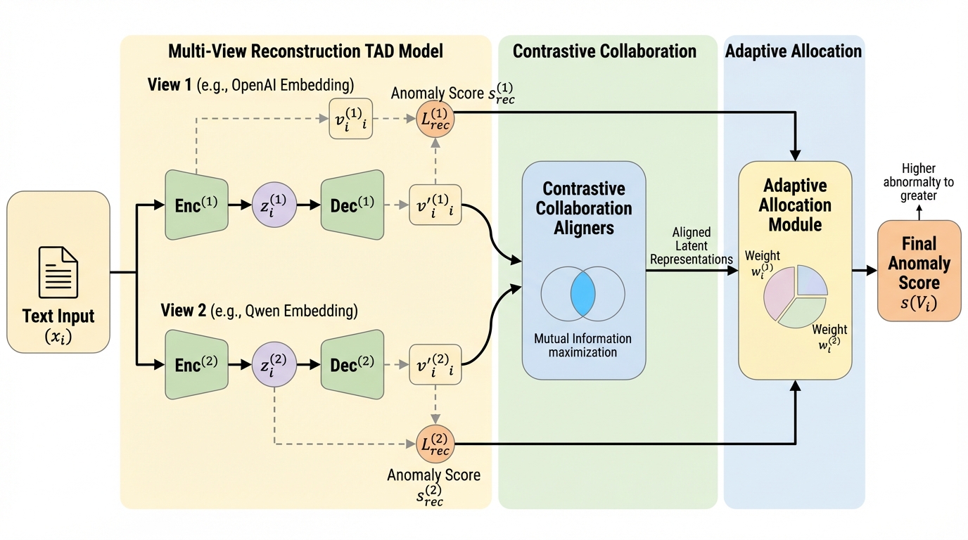 従来のテキスト異常検知は単一の埋め込みモデルに依存しており、特定のデータ分布への偏りや未知の異常に対する適応力の不足が大きな課題となっていましたが、本研究では複数の言語モデルの表現を統合する新しいフレームワークであるMCA²を提案しました。 この手法は、各視点での再構成誤差を活用するだけでなく、対照的学習によって異なるモデル間の整合性を強化し、さらにデータの特性に応じて各モデルの寄与度をサンプル単位で動的に調整する適応的割り当てモジュールを導入しています。 広範な実験の結果、10種類のベンチマークデータセットにおいて既存の最先端手法を上回る検知精度を達成し、異なるアーキテクチャのモデルを組み合わせることで単一モデルの限界を克服できることを実証しました。