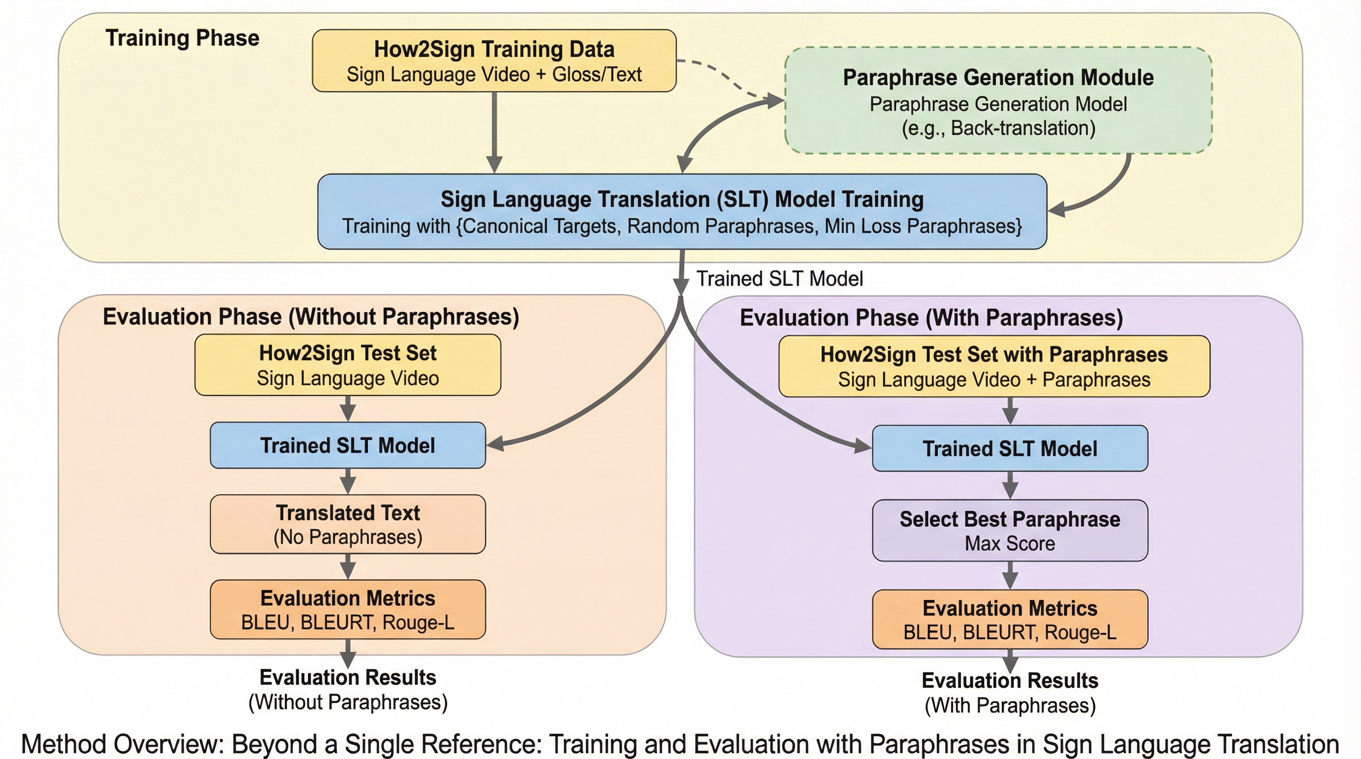 本研究の核心は、大規模言語モデル(LLM)を用いて、手話翻訳コーパスの書き言葉部分を自動的に言い換え、合成的な代替参照文を生成することにある。このアプローチにより、手話翻訳における「正解」の幅を広げ、より柔軟な学習と評価を可能にすることを目指している。具体的には、二つの主要な目的が設定された。第一に、言い換えによって生成された翻訳バリエーションが、T5のようなシーケンス・ツー・シーケンス型の手話翻訳モデルの堅牢性を向上させることができるかを調査することである。第二に、これらの言い換えが自動評価指標にどのような影響を与えるかを検証し、人間の評価との整合性を確認することである。 提案手法の重要な要素として、言い換えの質を評価するための指標「ParaScore」の適応が挙げられる。質の高い言い換えとは、元の意味を正確に保持しつつ、語彙や構文において十分な多様性を持っている必要がある。…