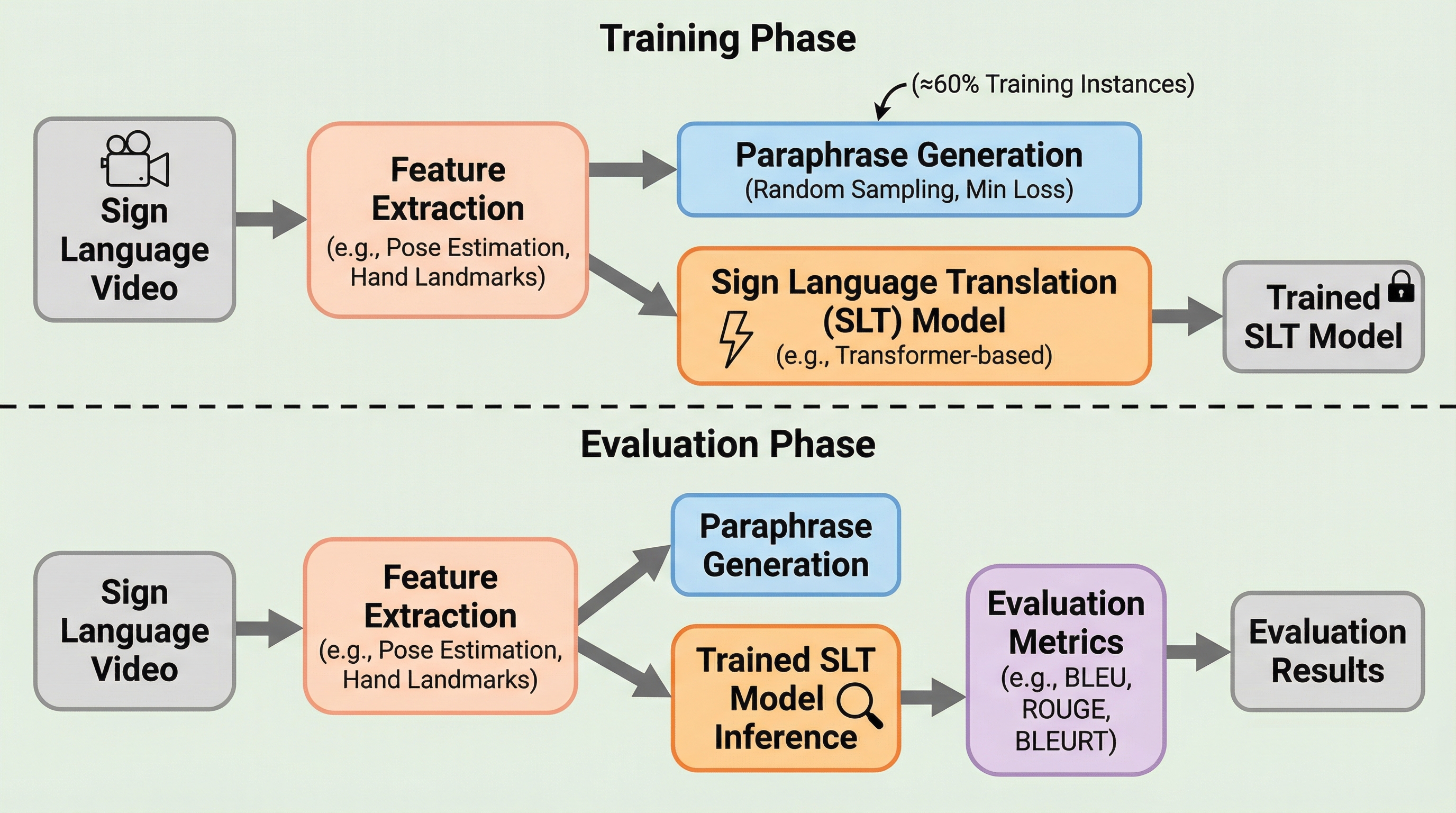 現在の手話翻訳(SLT)データセットは、一つの手話に対して一つの書き言葉しか対応していないため、翻訳の多様性を評価できないという課題がありました。本研究では、大規模言語モデル(LLM)を用いて書き言葉のパラフレーズ(言い換え)を自動生成し、複数の正解候補(参照訳)として活用する手法を提案しました。