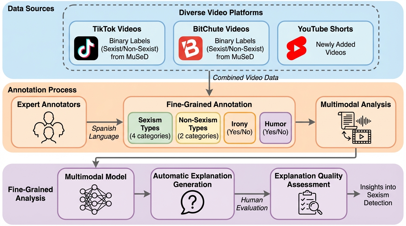性差別は単一の表現に限られず、社会制度、日常的な相互作用、個人の信念表明など、複数の水準で現れると整理されています。ソーシャルメディアはその影響を増幅し得るため、モデレーション現場では自動化ツールが広く用いられている一方、既存の仕組みは性差別か非性差別かの二値分類にとどまりがちです。その場合、文脈に強く依存する含みや、暗黙的で遠回しな言い回しが、細かなラベルの不足によって拾いにくくなると問題提起されています。さらに、性差別だとフラグを立てるだけで明確な理由が示されないと、透明性が欠け、利用者やモデレーターの信頼を損ね得る点も指摘されています。 研究動向としては、詳細な性差別検出はテキスト中心の資源(例えばXやRedditのデータ)で進んできた一方、マルチモーダルで粒度を上げた研究はミームが主戦場になり、テキストと画像の関係性が焦点になりやすかったと整理されています。これに対して動画は、画面内の映像、音声発話、字幕や画面テキストが相互に作用するため、どのモダリティに根拠があるのかを切り分けつつ、詳細タイプまで扱う枠組みが必要になります。…