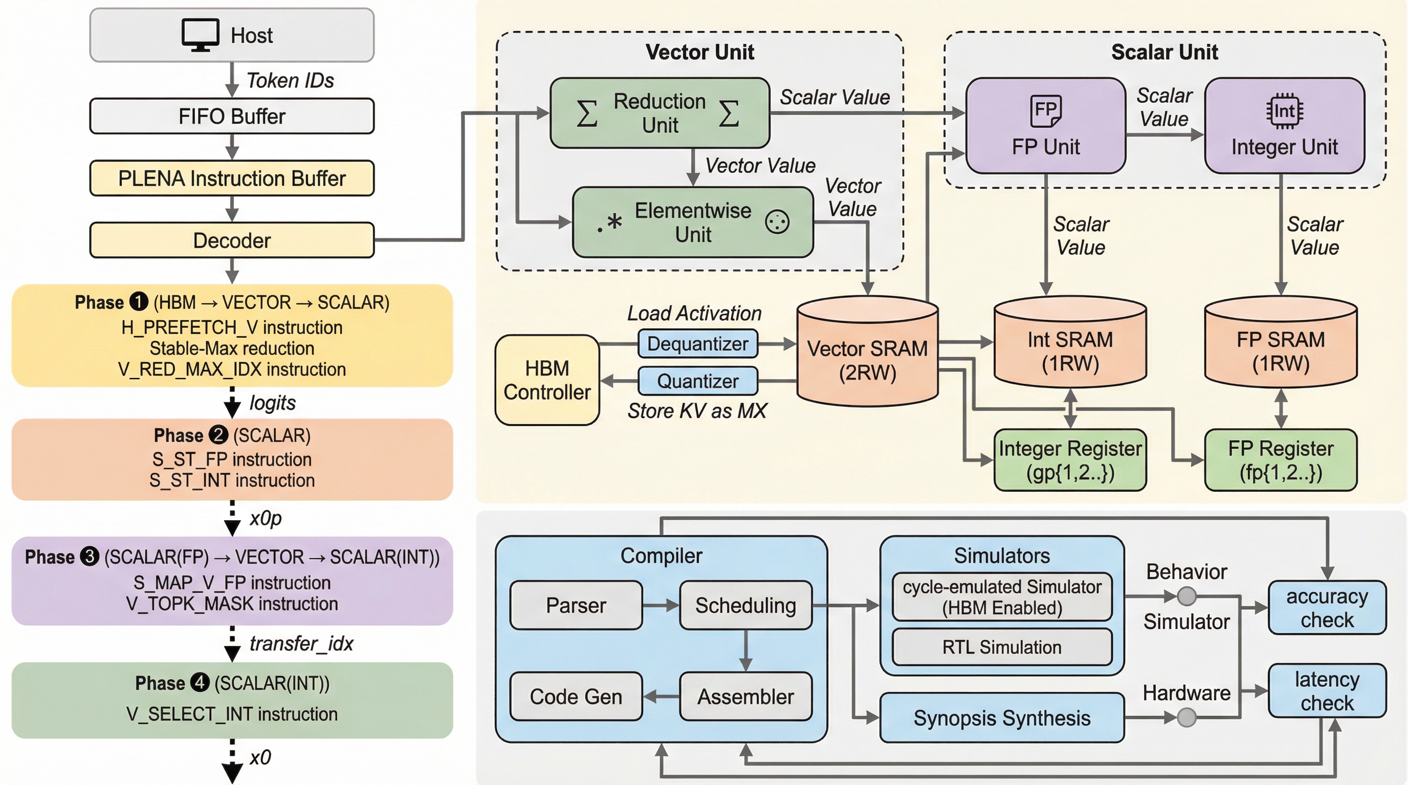 本研究は、dLLMのサンプリングを効率化するためのアーキテクチャ拡張として「d-PLENA」を提案している。これは、従来のGEMM中心の設計から脱却し、ベクトルおよびスカラー演算を最適化する命令セット(ISA)とメモリ構造を備えたものである。主な提案内容は、ハードウェアに適した実行フローの再構築、軽量な非GEMM命令プリミティブの導入、そしてデータ型ごとに分離された混合精度メモリ階層の3点に集約される。まず、数学的な等価性を維持しつつ、インプレース計算と段階的なメモリ再利用を可能にする「Stable-Max」定式化を導入した。これにより、従来のソフトマックス関数が必要としていた複数のメモリパスとグローバルな正規化処理を、ハードウェアモジュールに直接マッピング可能な原子的な操作に分解している。…